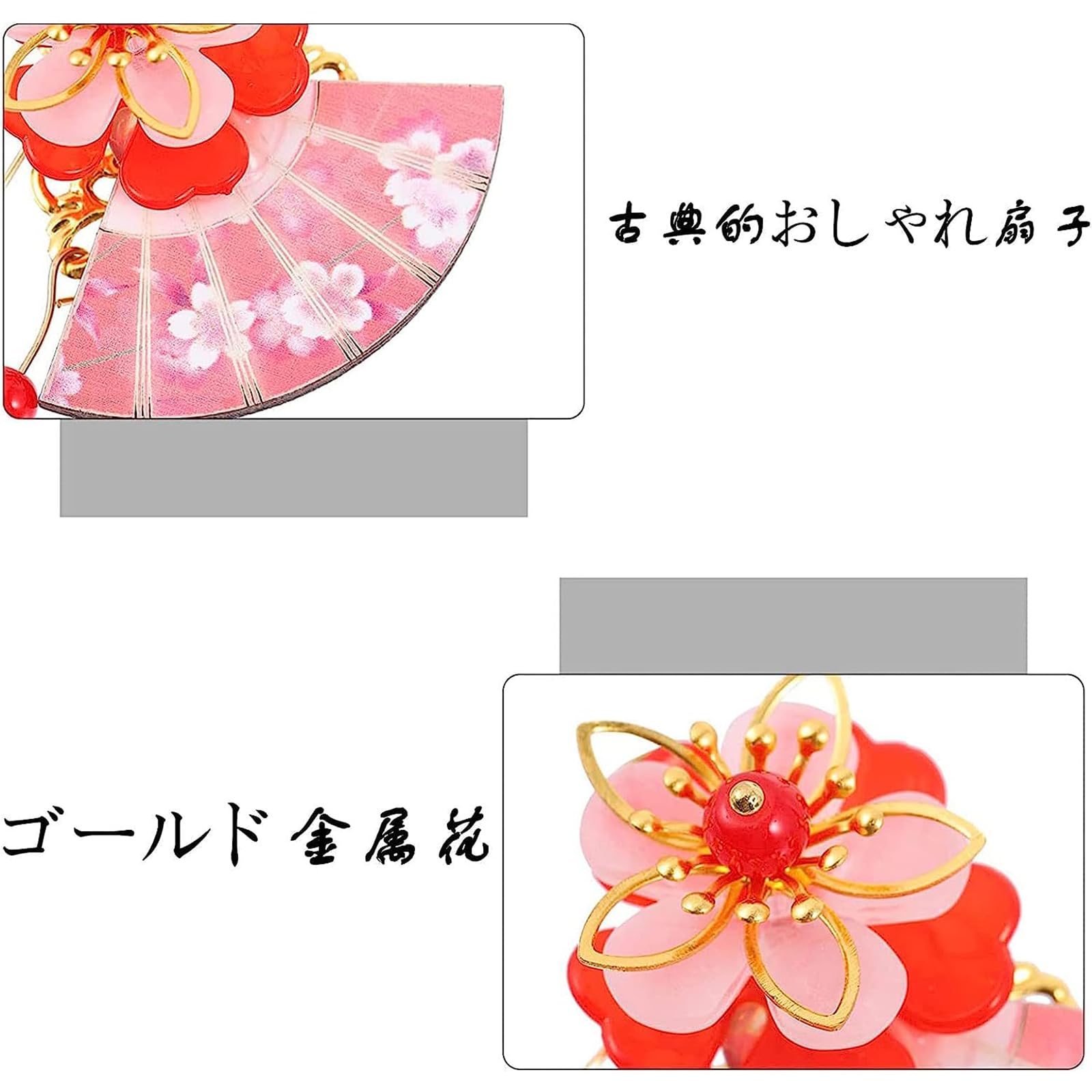 【可愛い髪飾り】古典的おしゃれ木製扇子、長いフリンジ、ゴールド金属花、かわいい鈴。 下がり飾りが歩くたびに揺れ、髪のオシャレをさりげなく彩ります。花の中心にはパールをあしらい、可愛く装飾されています。