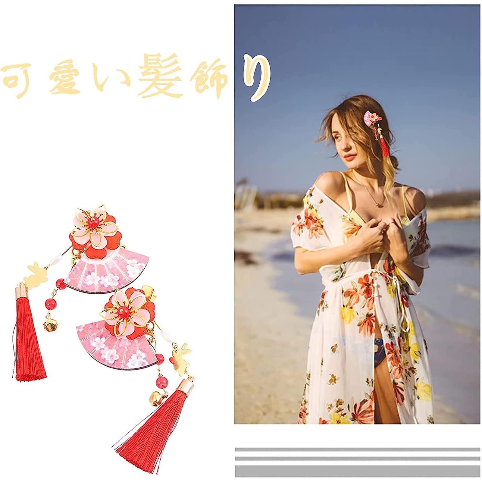 【人気商品】ヘアピン ヘアアクセサリー 女性 子供髪飾り 2枚組 古典的 扇子 鈴 タッセル ヘアクリップ 中華風 漢服 浴衣 和装 ヘアクリップ 入学式 卒業式 七五三 コスプレ プレゼント (レッド)