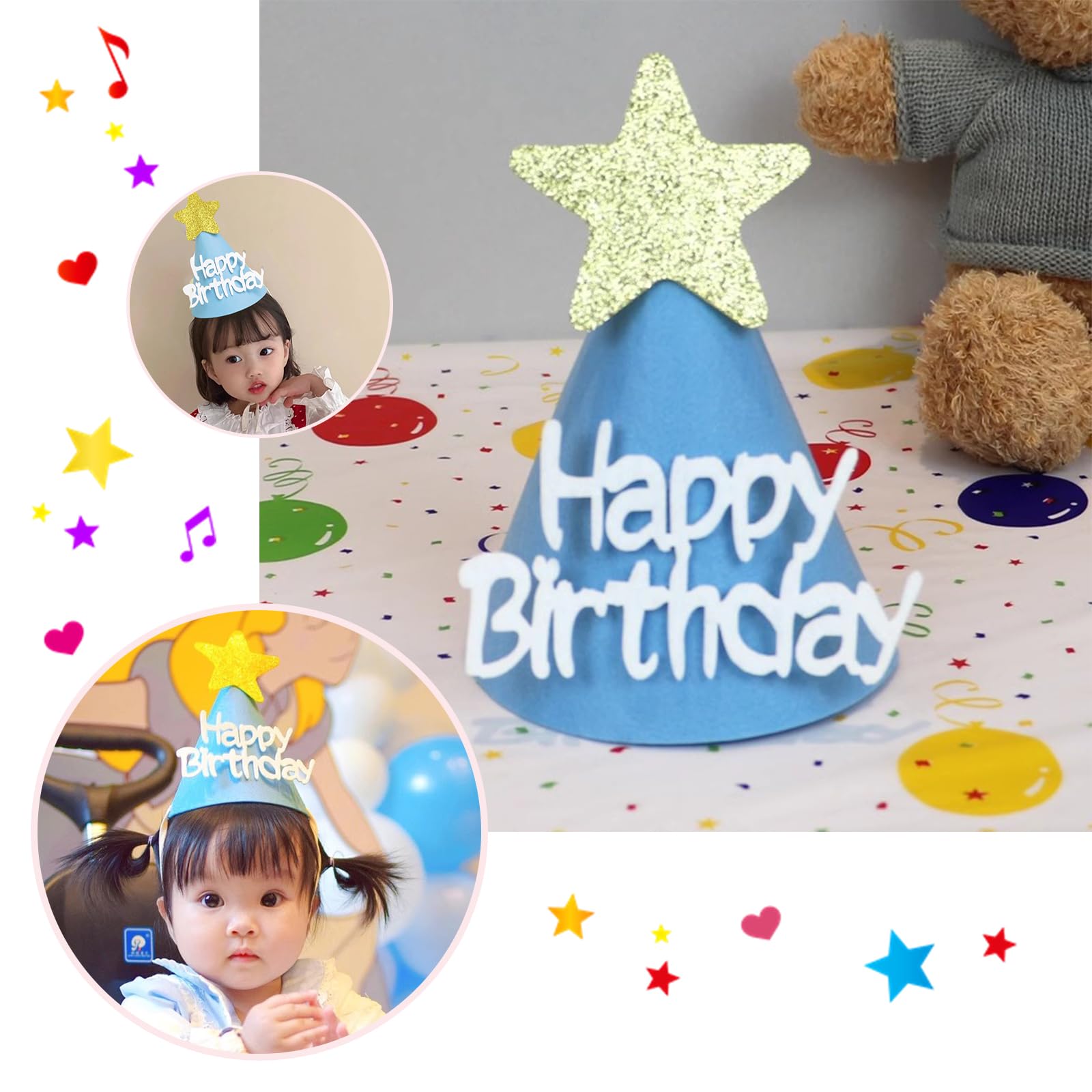 【簡単組み立て】バースデーハットを円錐形に丸め、丸い釘で縁を固定し、ハットの穴に輪ゴムを通して調整固定します。 帽子を受け取ると、平らで、子供と一緒に作ることができ、達成感を感じることができます。