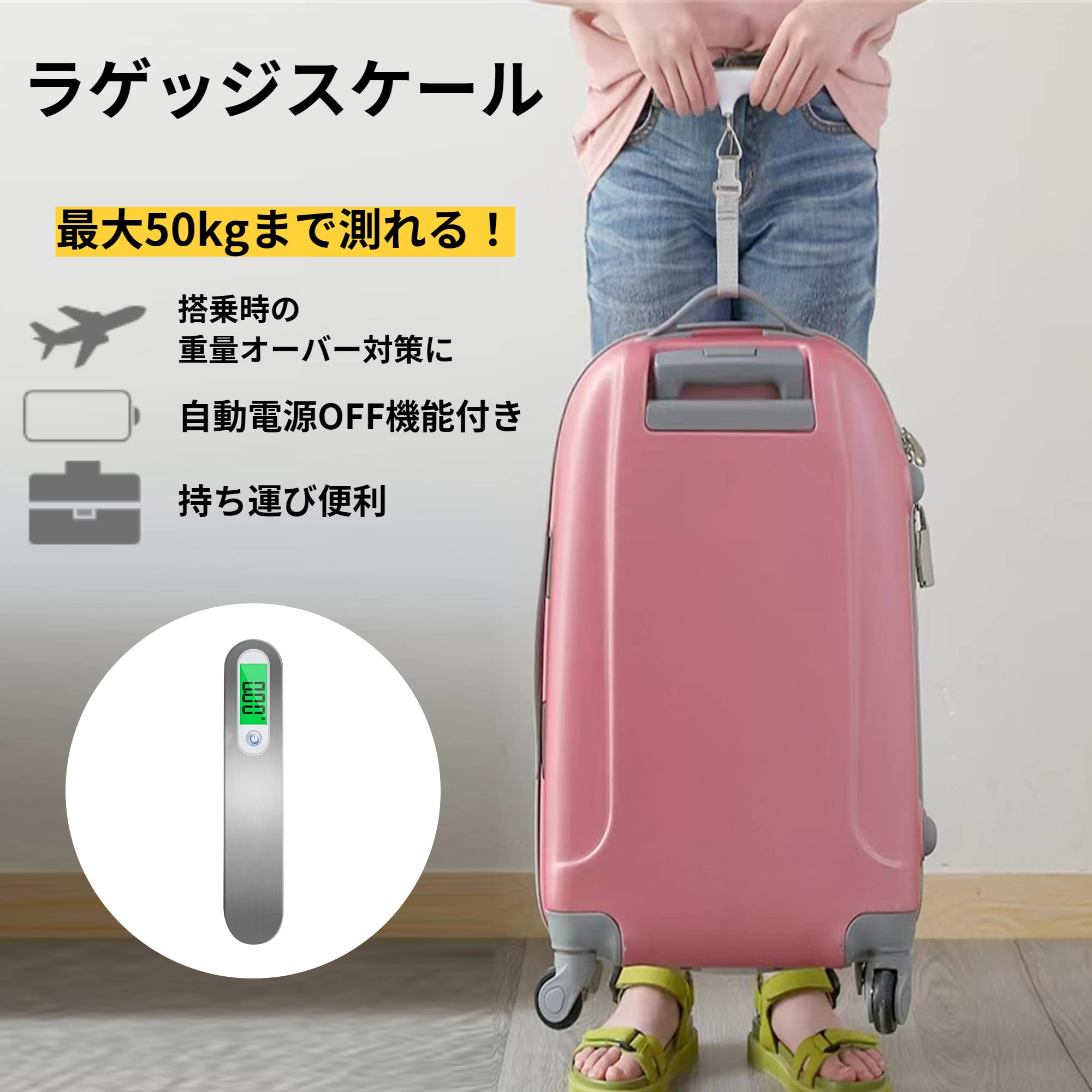 ●搭乗時の重量オーバー対策 携帯デジタルスケールを使って、旅行等で荷物の重さを手軽に測れます。 デジタルスケールは50kgまで測れます。 海外旅行に行く前に荷物の重量確認なども使用できます。 高精度計量で、超過の料金や無駄な送料を支払いすることを避けます。