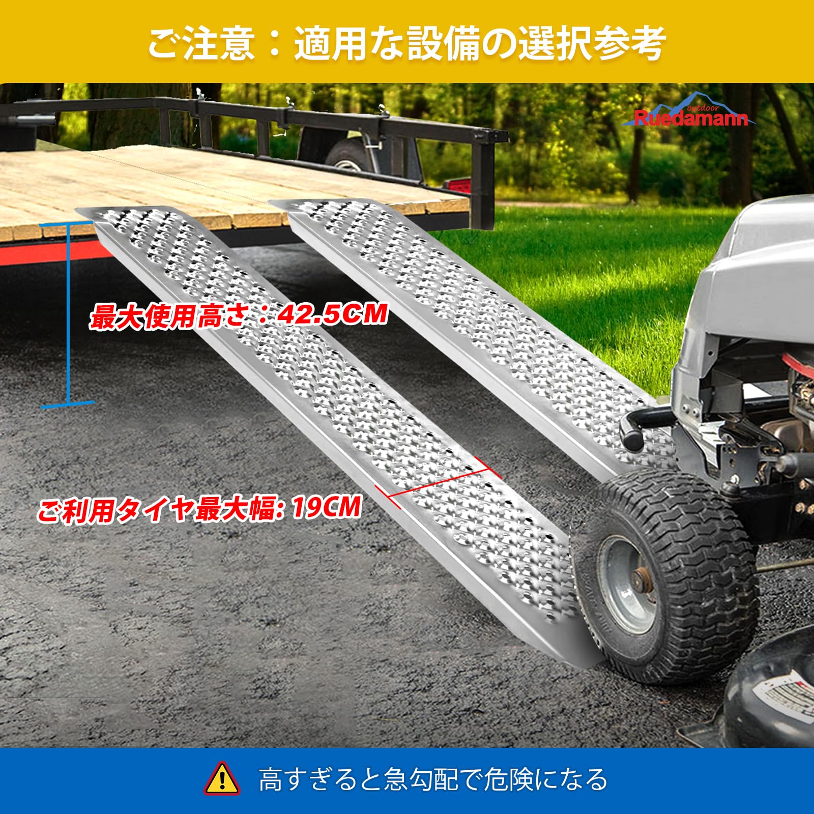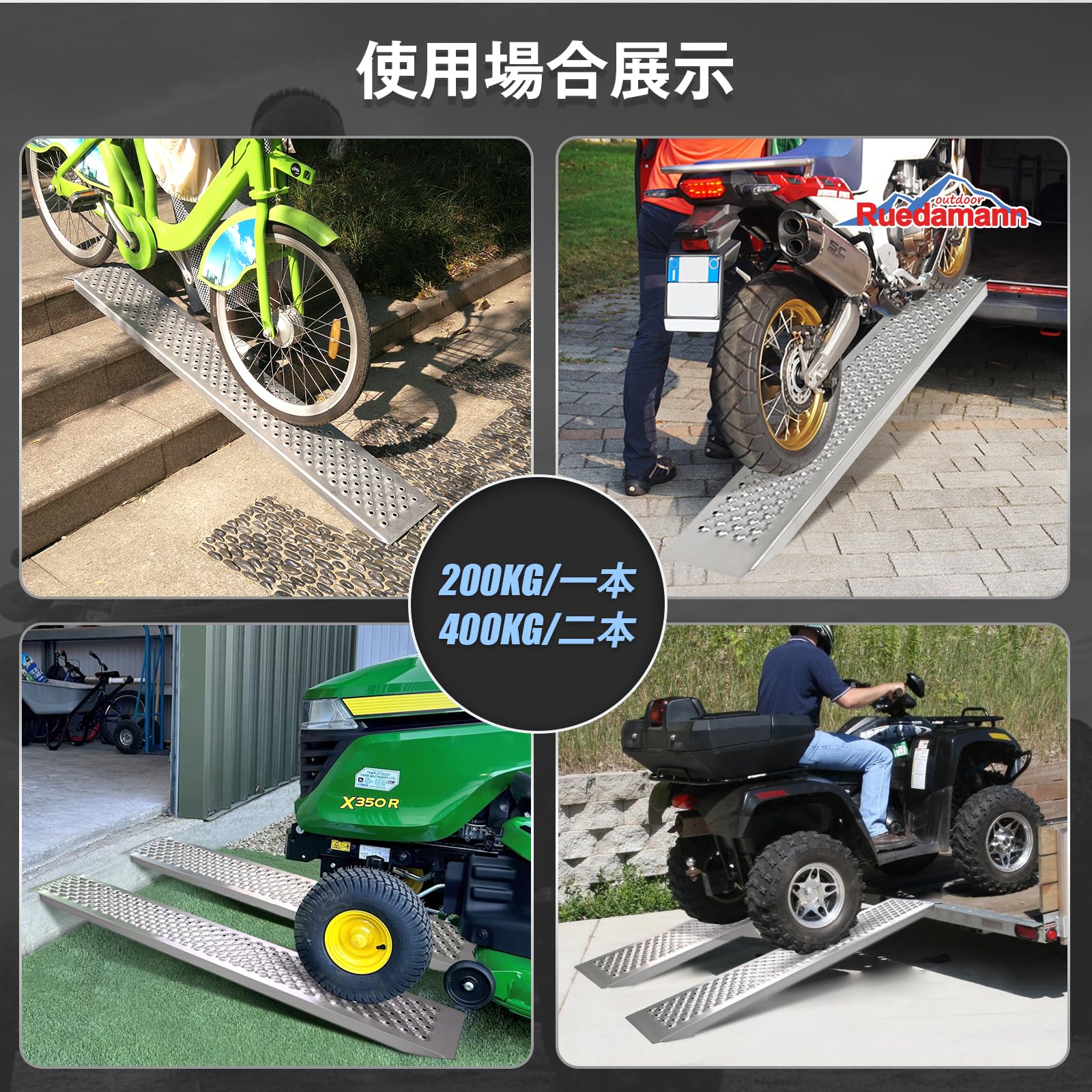 幅広い対応:Ruedamannのラダーは、単本使用時の耐荷重が200kgで、自転車やオートバイクに適しています。2本使用時には耐荷重400kgとなり、ATV四輪バギー、芝刈り機、除雪機、薪割り機などの機材にも対応可能です。ガレージや納屋、小屋への積み込みや、軽トラ・トラックへの積載もスムーズに行えます。