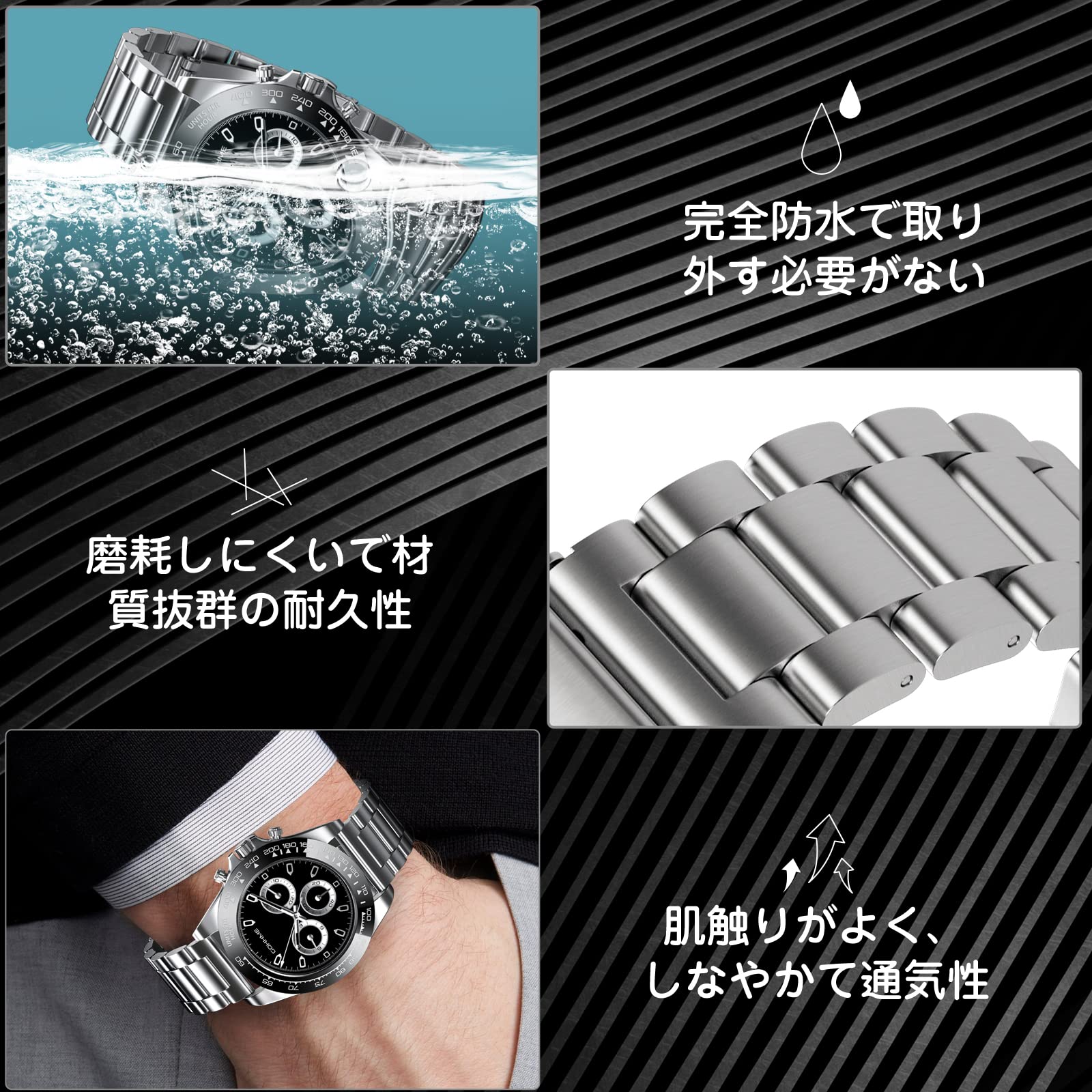 【高品質時計ベルト&長さ調整でき】Qosea時計バンドは、高品質の304ステンレススチール、ハイテク表面で作られ、頑丈で型崩れしません。表面は滑らかで、耐水性、耐久性に優れています。、手首にフィットして快適です。ラバー特有の嫌な臭いもなく、質感や手触りに優れ、柔軟性と強度を兼ね備えています。