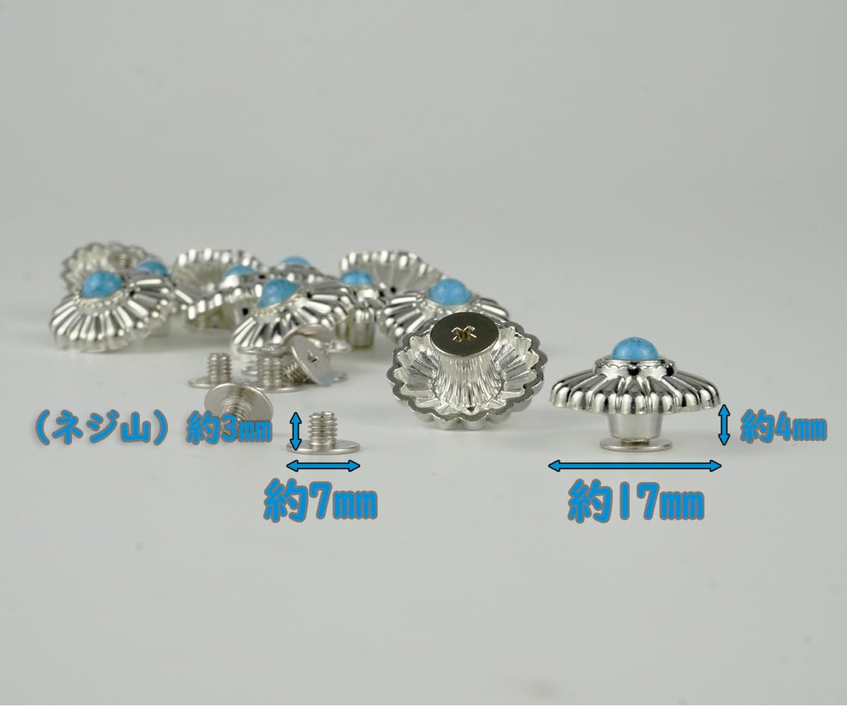 コンチョのサイズ:直径約17mm(画像にご参考ください) カラー:ターコイズブルー・シルバー仕上げ 材質:合金