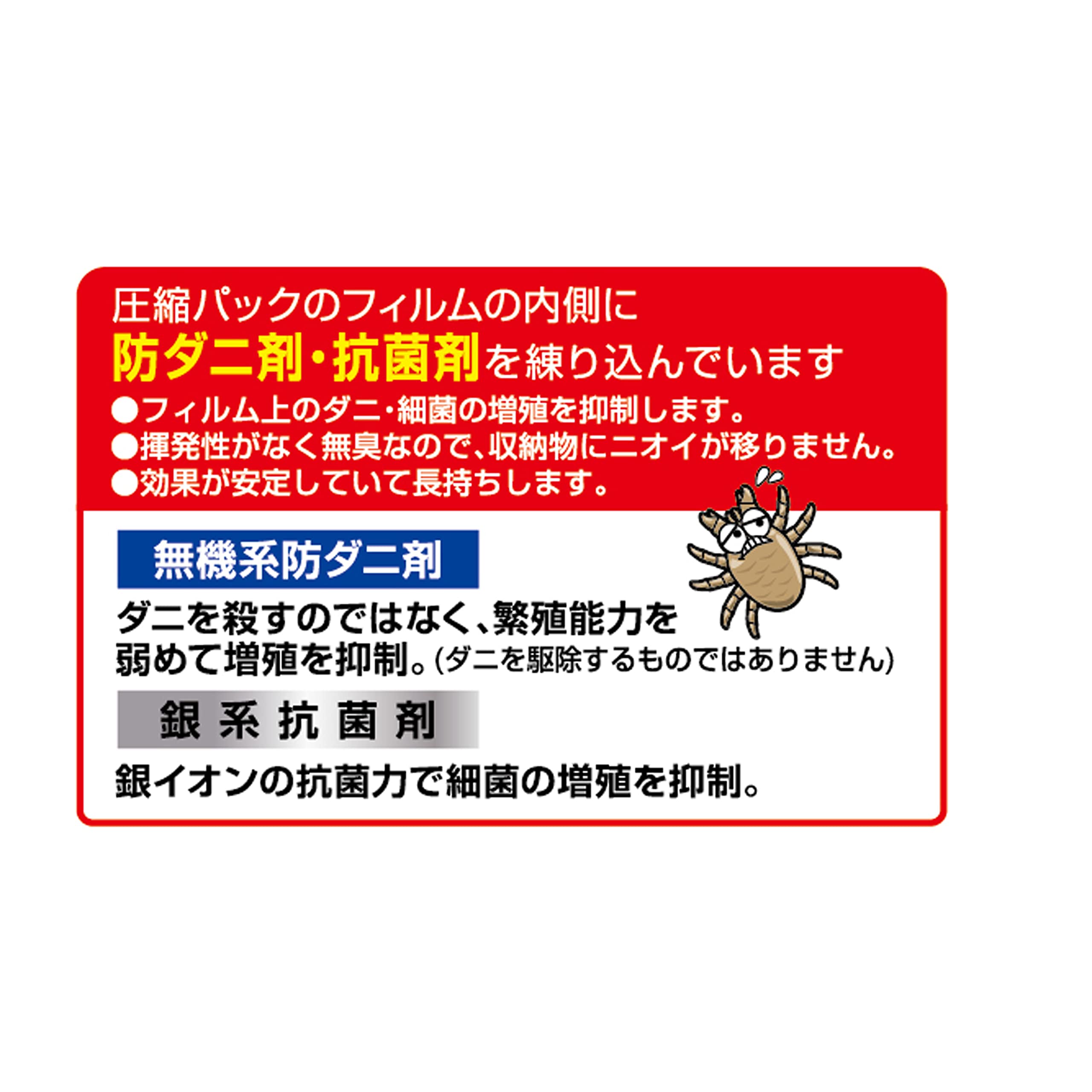 ●圧縮袋のフィルムの内側に防ダニ剤・抗菌剤を練りこんでいますので、フィルム上のダニ・細菌の増殖を抑制します。揮発性がなく無臭なので、収納物にニオイが移りません。効果が安定していて長持ちします。無機系防ダニ剤を使用していますので、ダニを殺すのではなく、繁殖能力を弱めて増殖を抑制します。(ダニを駆除するものではありません。)銀系抗菌剤は銀イオンの抗菌力で細菌の増殖を抑制します。