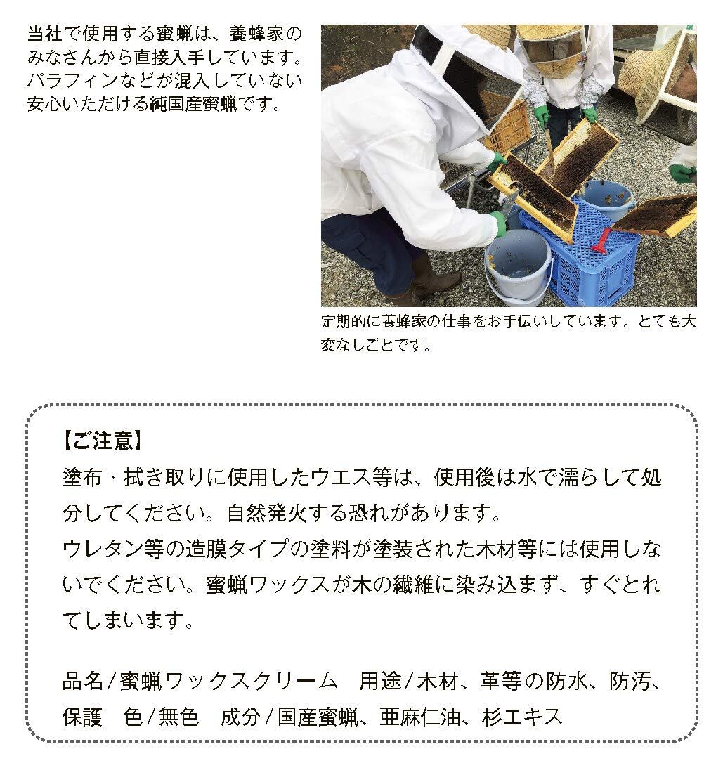 長野、岐阜、北海道で採れた国産蜜蝋、亜麻仁油、杉エキスによる100%天然素材で製造した蜜蝋ワックスです。小さいお子様がいるご家庭でも安心してお使いいただけます。