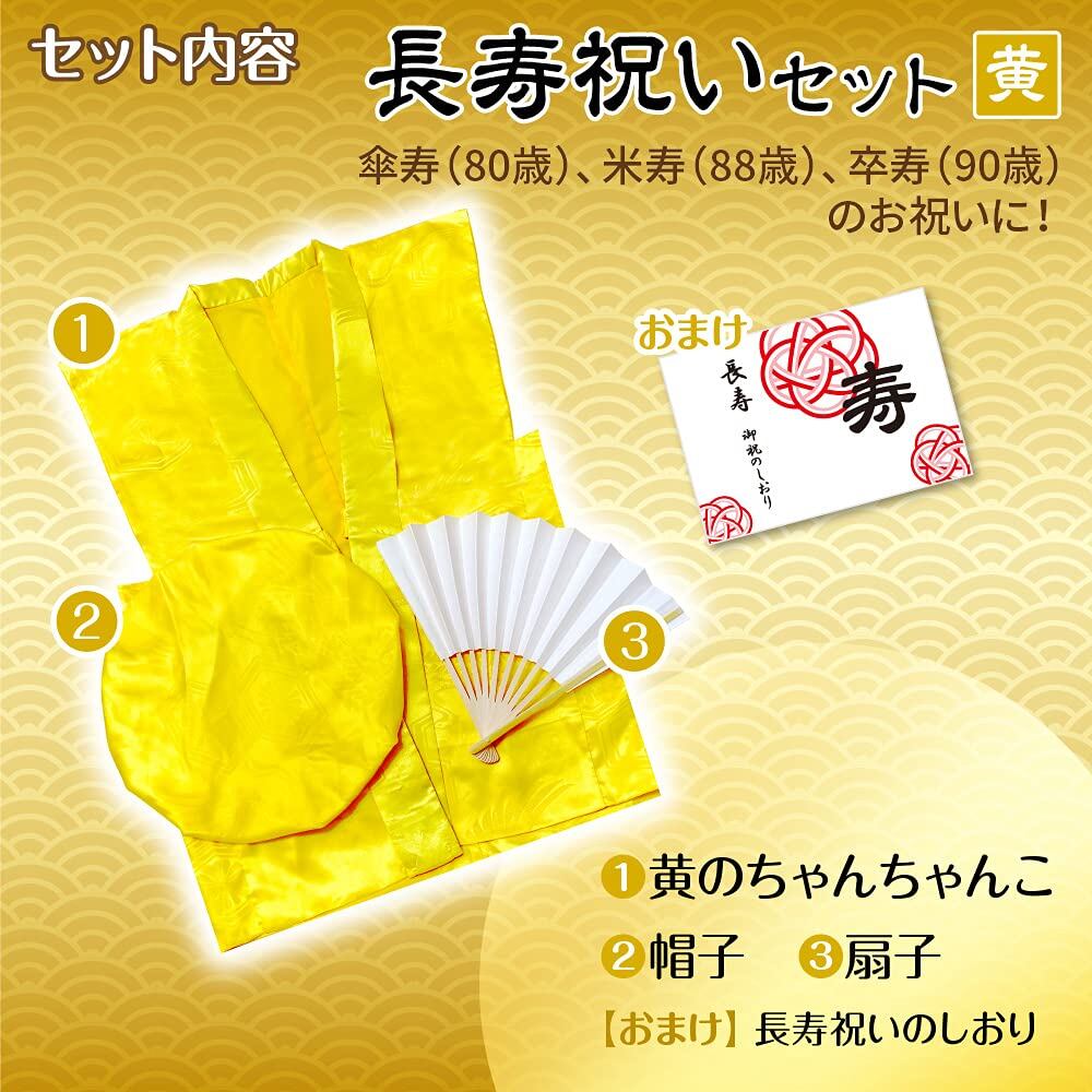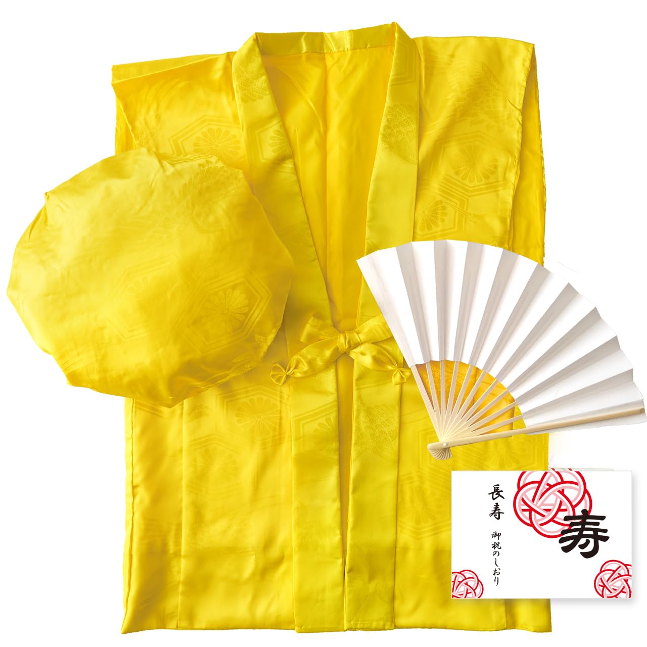長寿祝いの必須アイテム、黄色のちゃんちゃんこセットです。傘寿(80歳)、米寿(88歳)、卒寿(90歳)のお祝い向けです。ちゃんちゃんこに頭巾と扇子のセット!