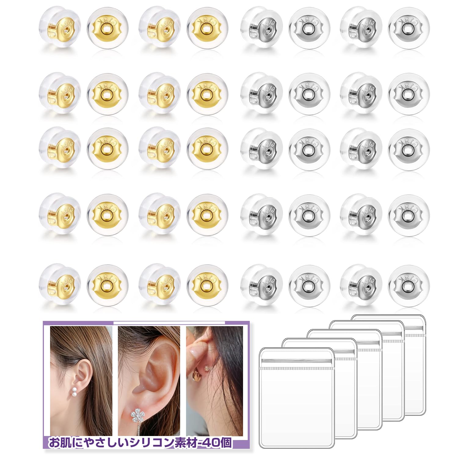 【在庫セール】ピアス キャッチ シリコン 落ちない ピアスキャッチ 留め具 金属アレルギー対応 K18メッキ ピアスキャッチシリコン 20ペア(40個)セット ポスト対応0.65mm〜0.7mm レディース メンズ 透明収納袋付き (金+?)