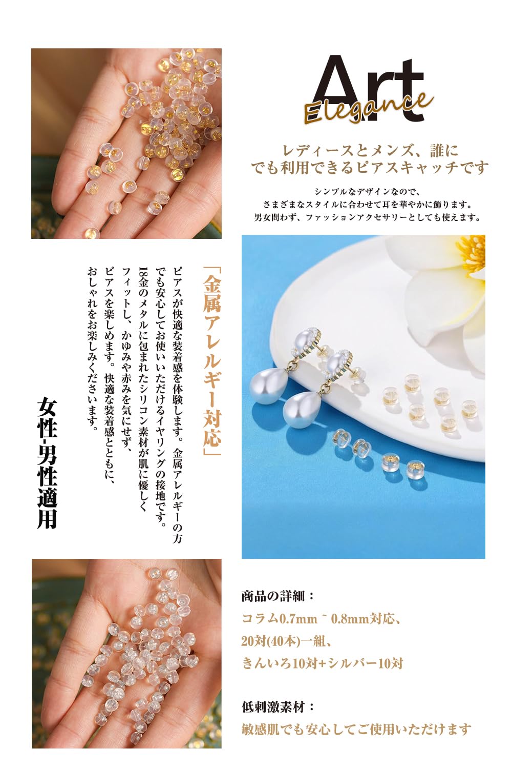 【ピアス外れない】はコラム0.65mm ~ 0.7mm対応、20対(40本)一組、18金メッキロック+シリコン製です。イヤリングをおしゃれに楽しみたい人に最適なイヤリングキャッチです。耳を美しく飾り、装着時の安定感を保ちます。