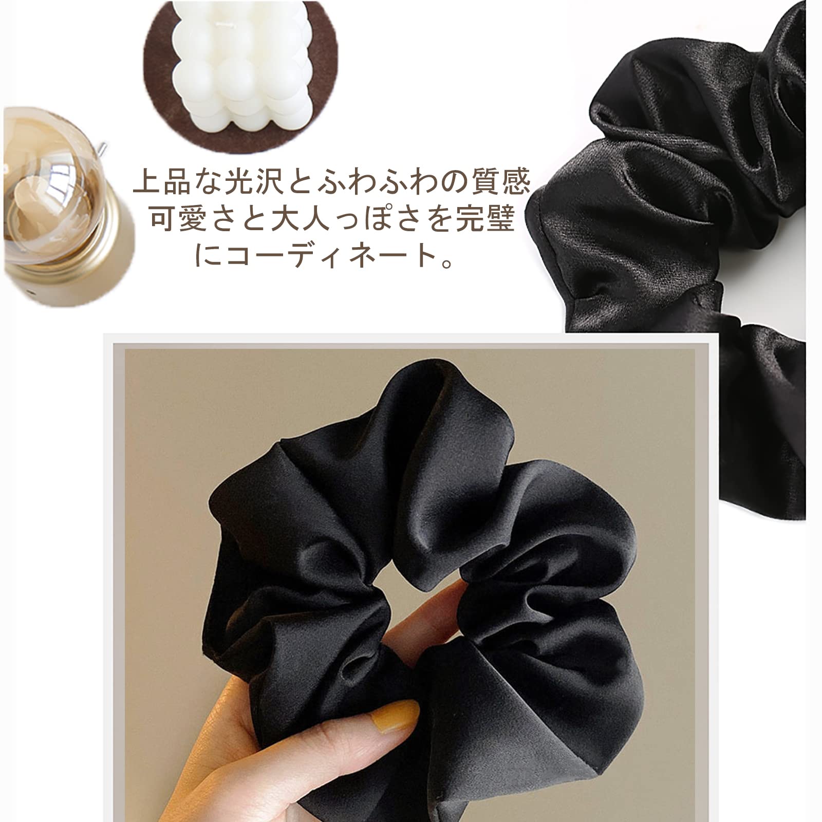 ?【【エレガントなシュシュ】】ふわふわボリューム、ツルツルな光沢、極上の肌触り落ち着いた上品なお色味はいとなの気品溢れる女性にぴったりです。柔らかい素材を採用して作られて、ゴムが強くて耐久性も高いです。簡単なまとめ髪やルーズ髪にあわせるだけでこなれ感UP!フェミニンで大人可愛いシルエットが完成します。
