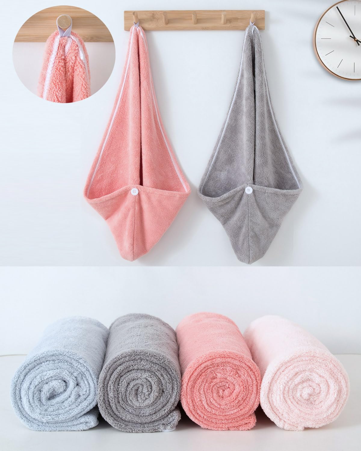 ヘアドライタオル ドライキャップ 【2枚セット】 速乾 髪タオル 長い髪専用 軽量 シャワーキャップ 強い吸水性 お風呂上がり ふわもこ ヘアターバン ヘアキャップ バス用品(ライトグレー+頬紅赤)