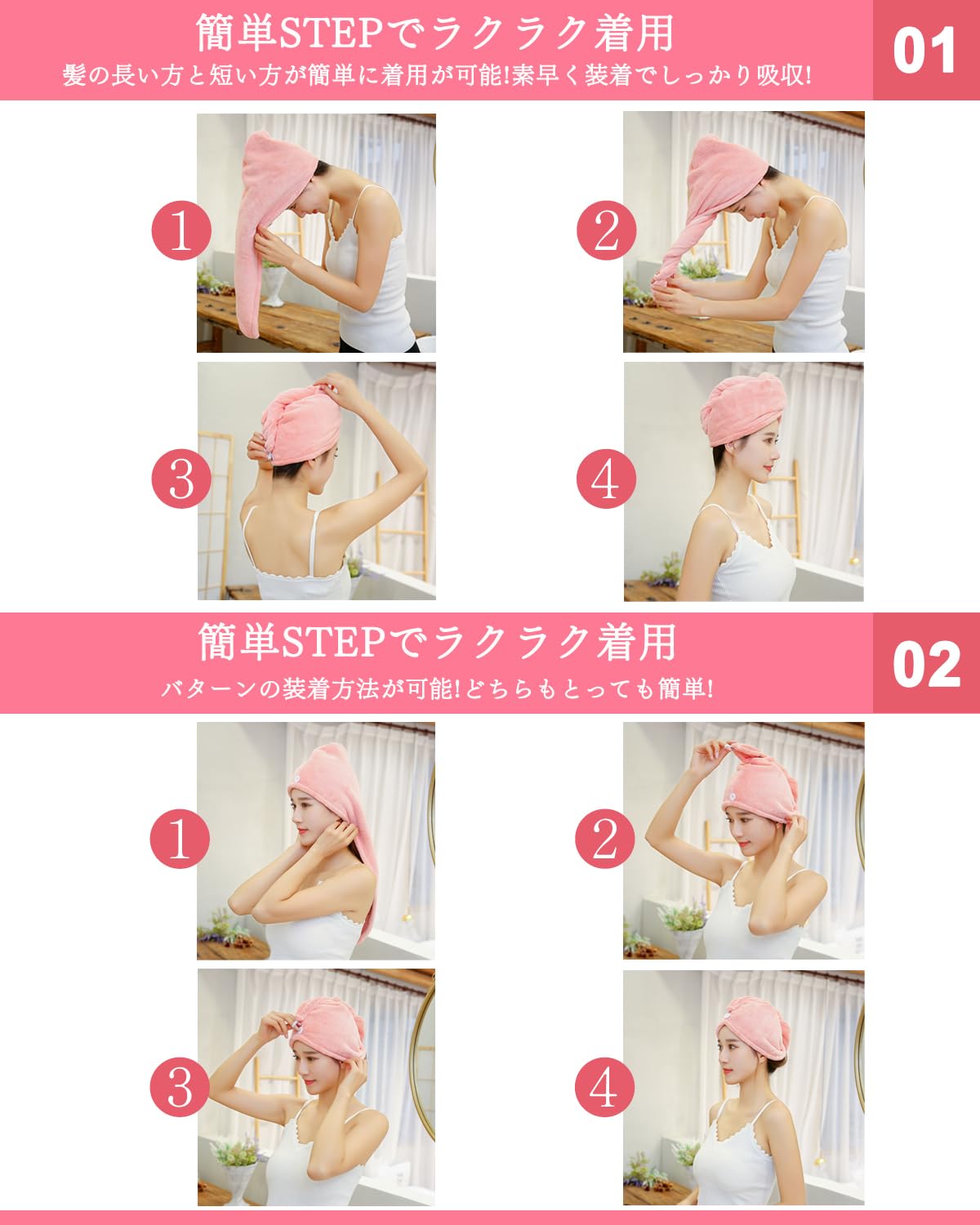 【特別なデザイン】ドライキャップがボタン付きなので、髪を包んだまま用事をしても落ちられません。風呂上がりとき、服を濡らすことが心配しないでください。シャワーキャップの構造が人性デザインですが、装着が簡単ですが、2種類があります。後ろ留め 1.髪の毛を包んで前に伸ばす 2.数回ねじって3.後ろでボタンを留めます。 前留め(ショートヘアはこっち)1.後ろで髪を包んで伸ばす 2.数回ねじって 3.前でボタンを留めます。