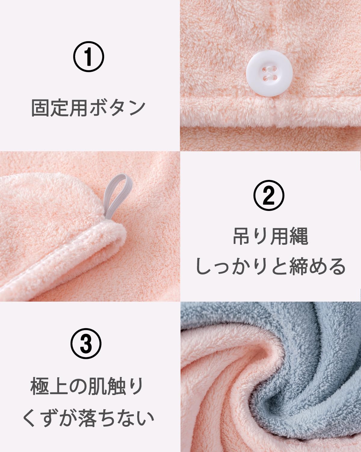 【特別なデザイン】ドライキャップがボタン付きなので、髪を包んだまま用事をしても落ちられません。風呂上がりとき、服を濡らすことが心配しないでください。シャワーキャップの構造が人性デザインですが、装着が簡単ですが、2種類があります。後ろ留め 1.髪の毛を包んで前に伸ばす 2.数回ねじって3.後ろでボタンを留めます。 前留め(ショートヘアはこっち)1.後ろで髪を包んで伸ばす 2.数回ねじって 3.前でボタンを留めます。