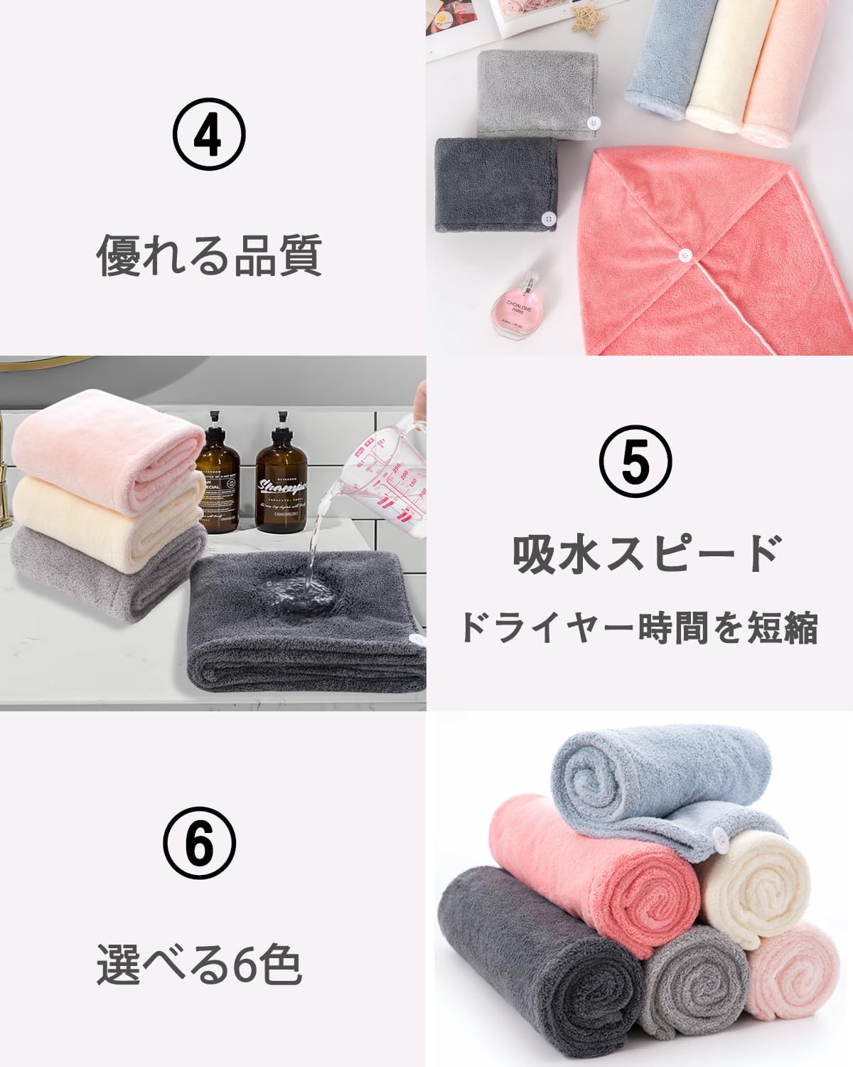【材質】:ポリエステル85%、ポリアミド15%高級マイクロファイバー素材を採用 - 伝統的な綿タオルと比べると、このヘアードライタオルは毛髪の1/100超微細繊維(マイクロファイバー)で作られたヘアドライタオルです、柔軟で心地良い肌触りです、髪を守ります。品質:このタオルが色褪せない、毛羽落ちしないことをします。