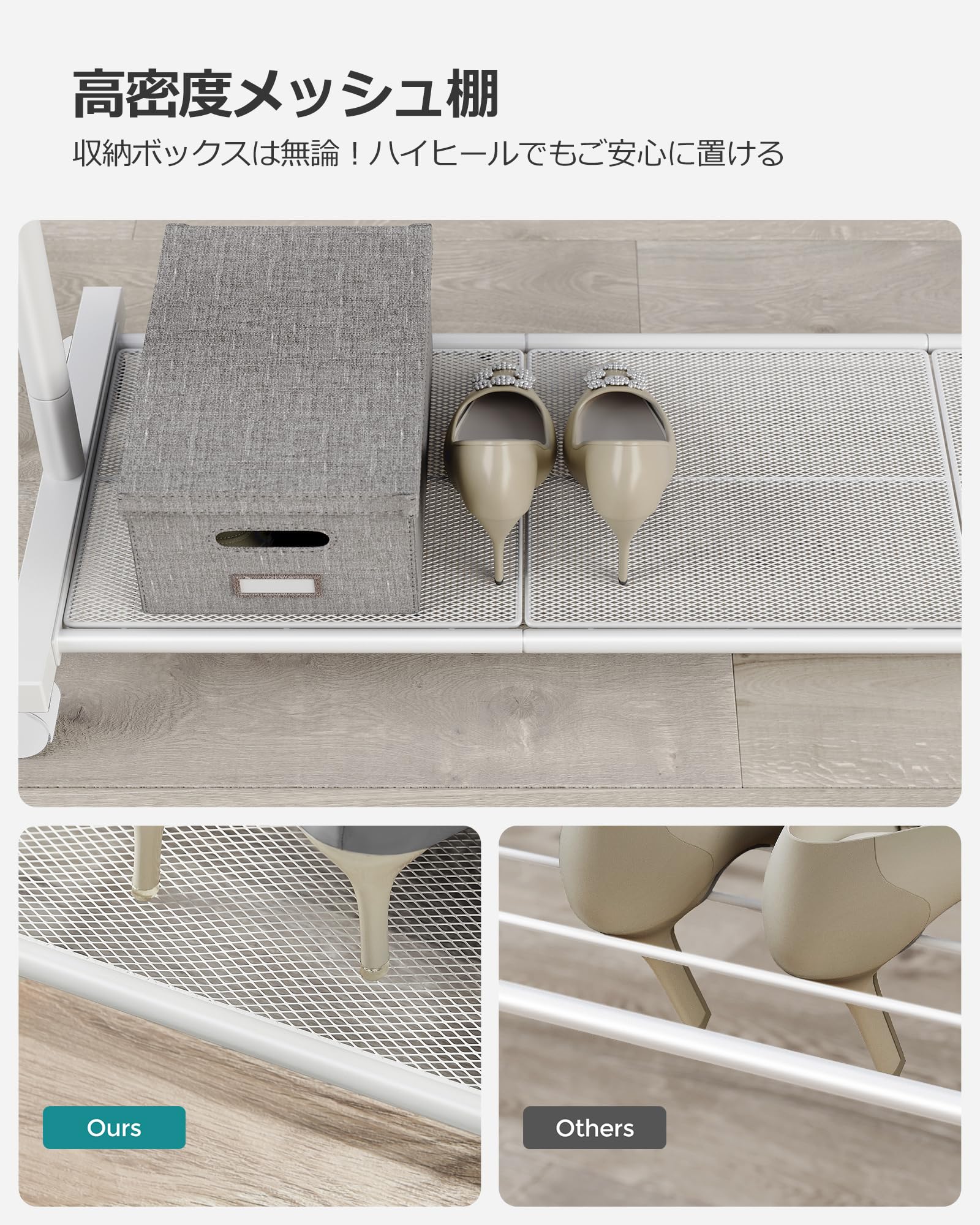 【たっぷり収納】耐荷重は約50kgまで達していますので沢山の洋服、カバン等を掛けられます。下にはメッシュ棚が付いているので、棚に収納ボックスや靴等も収納できます。物干しとしてもご利用できます