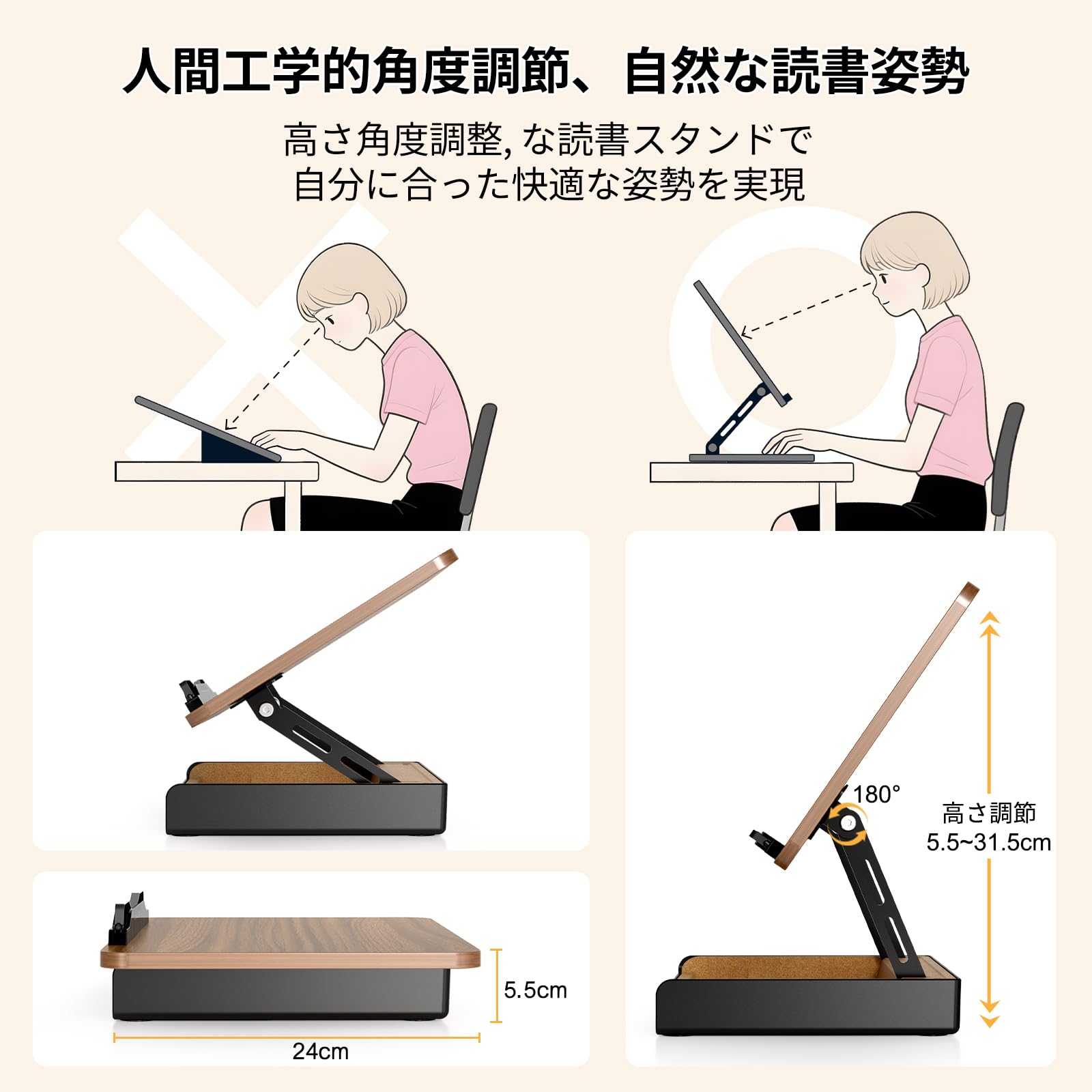 【高さ&角度 無段階調整】5〜32cmの広範囲な高さ調節と0〜180°の角度調節が可能。本を視線の高さに合わせることで、首・肩・腰への負担を軽減。お子様から大人、シニアの方まで快適に使える読書スタンドです