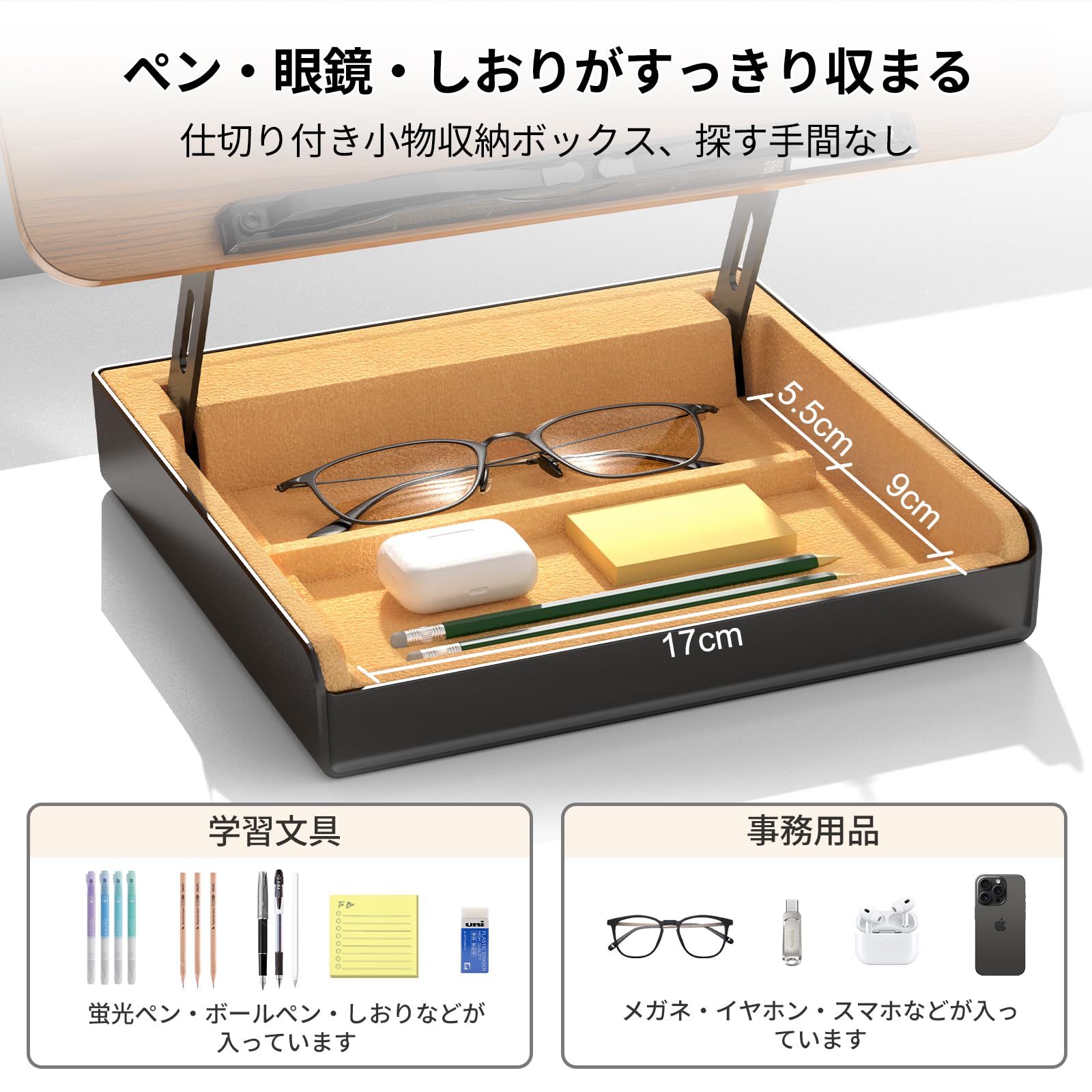 【収納トレー内蔵】:ベースにペン、付箋、イヤホンなどの小物をすっきり収納できる整理スペースを完備。必要なものがすぐ手に取れるので、作業スペースを整然と保てます