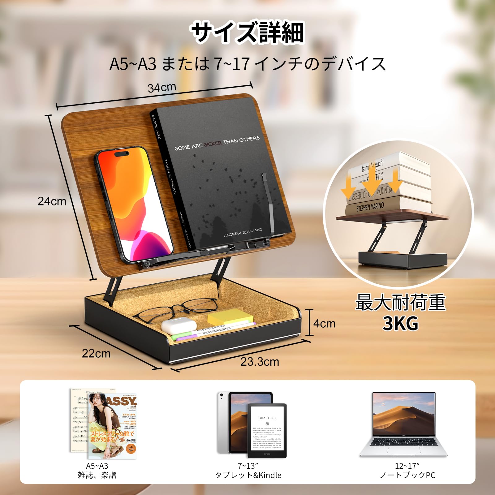【木調パネル設計】高品質MDF材と金属部品を使用したスタンド。34×24cmの広々パネルで最大3kgまで対応。教科書、料理本、楽譜、雑誌、タブレット(Fire HD/Kindle)、ノートPCなど、さまざまなアイテムを安定して保持。快適な読書角度を実現