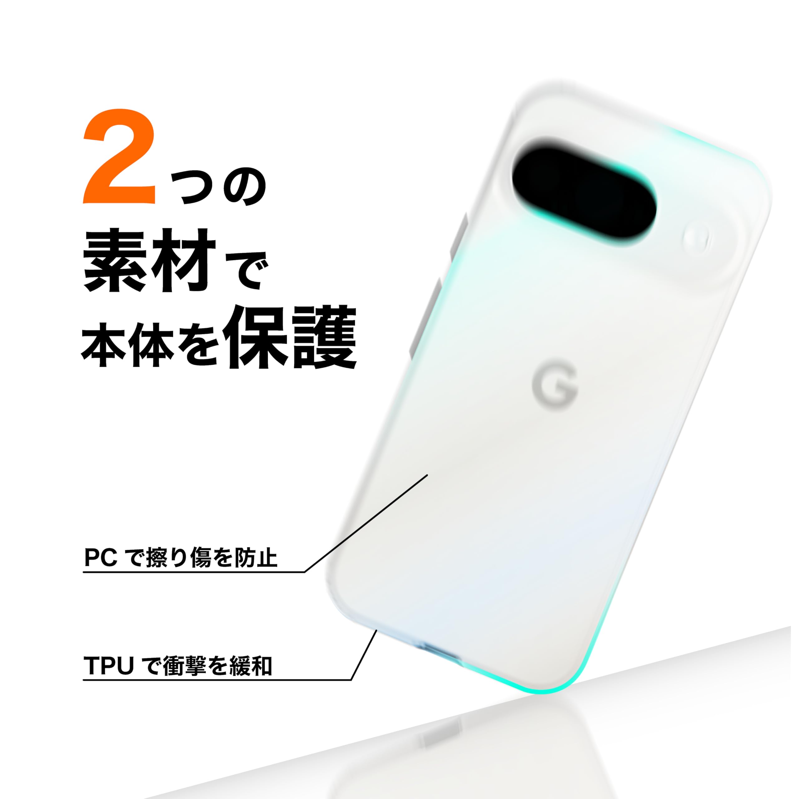 【耐衝撃・本体保護】カメラ部分をしっかり覆う、Google Pixel 9専用設計です。ケースをレンズから1.5mm、スクリーンから1.5mm高く設計。本体が直接地面に触れません。角部分と側面は衝撃吸収性に優れたTPU、背面は耐摩耗性に優れたポリカーボネートを使用しています。操作性を保持しつつ、カメラレンズと画面をしっかり保護します。