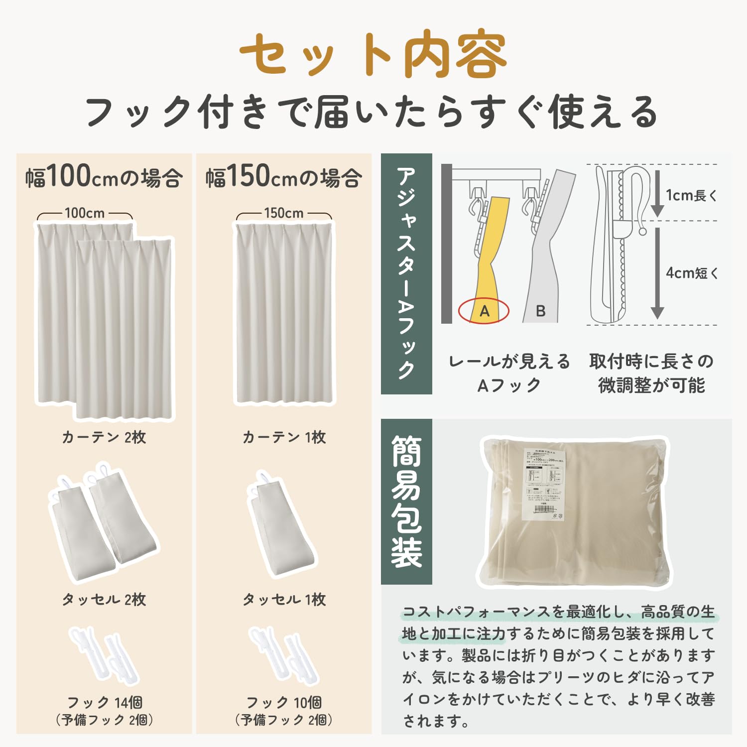 【セットで届く】カーテン2枚にアジャスターAフックが14個(+予備フック2個)、タッセルが2本付属しているので届いてすぐお使いいただけます。※弊社ではコストパフォーマンスを最適化し,高品質の生地と加工に注力するために簡易包装を採用しています。※折り目が気になる場合は、プリーツのヒダに沿ってアイロンをかけていただくことで、より早く改善されます。