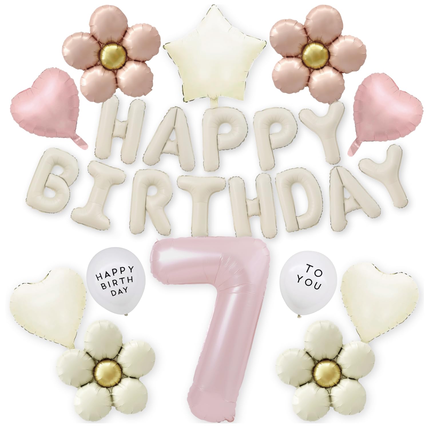【仕様】80cm数字バルーン7歳用, バースデーガーランド HAPPY BIRTHDAY, ピンクフラワー×2枚, クリームフラワー×2枚, ピンクハート×2枚, クリームハート×2枚, ラテックスバルーン HAPPY BIRTHDAY×2枚, TO YOU×2枚, 付属品:ストロー, リボン
