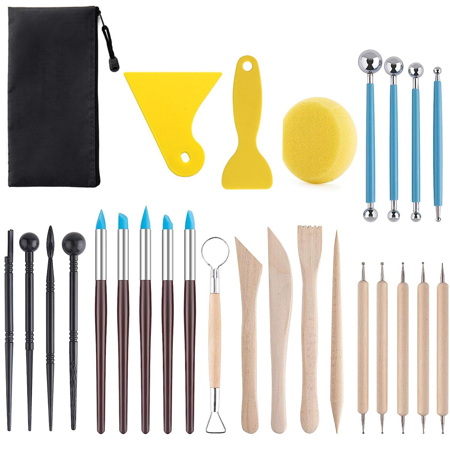 4.【セットには】木製彫刻/塑形工具5個、木製ハンドル球形ペン5個、シリカゲル粘土彫刻工具5個、ゴムハンドル球形ペン4個、プラスチックペン4個、泥切りブレード2枚、セラミックスポンジ1個、携帯用保存袋1個を含む完全な粘土工具セットが届きます