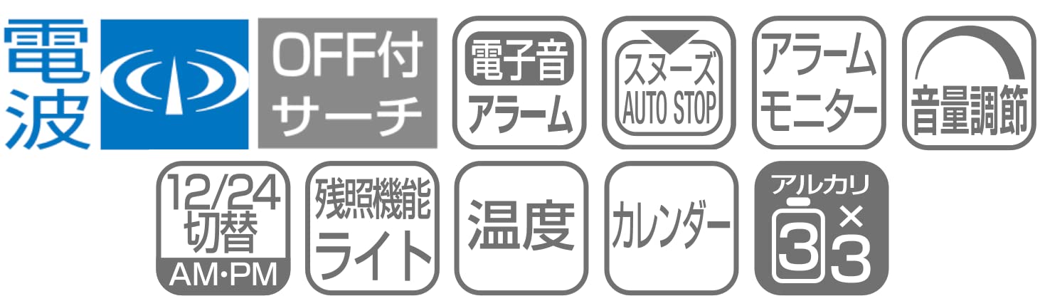 止めてもまた鳴るスヌーズ機能&アラームオートストップ機能。カレンダー、温度表示。音量調節ツマミ。12/24切換え表示。残照機能ライト付き。