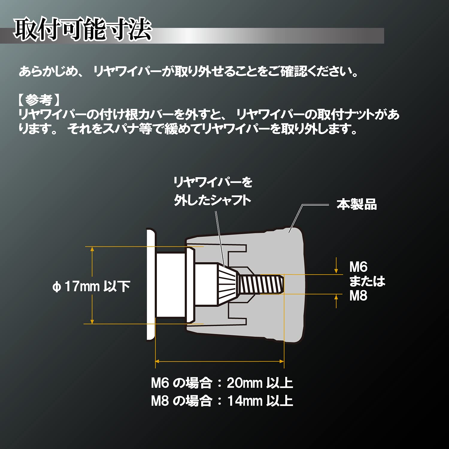 適合:M6×P1.0、M8×P1.25のリヤワイパーボルトに取付可能。リヤワイパーを取り外したシャフト寸法を確認してください(M6は20mm以上、M8は14mm以上)。