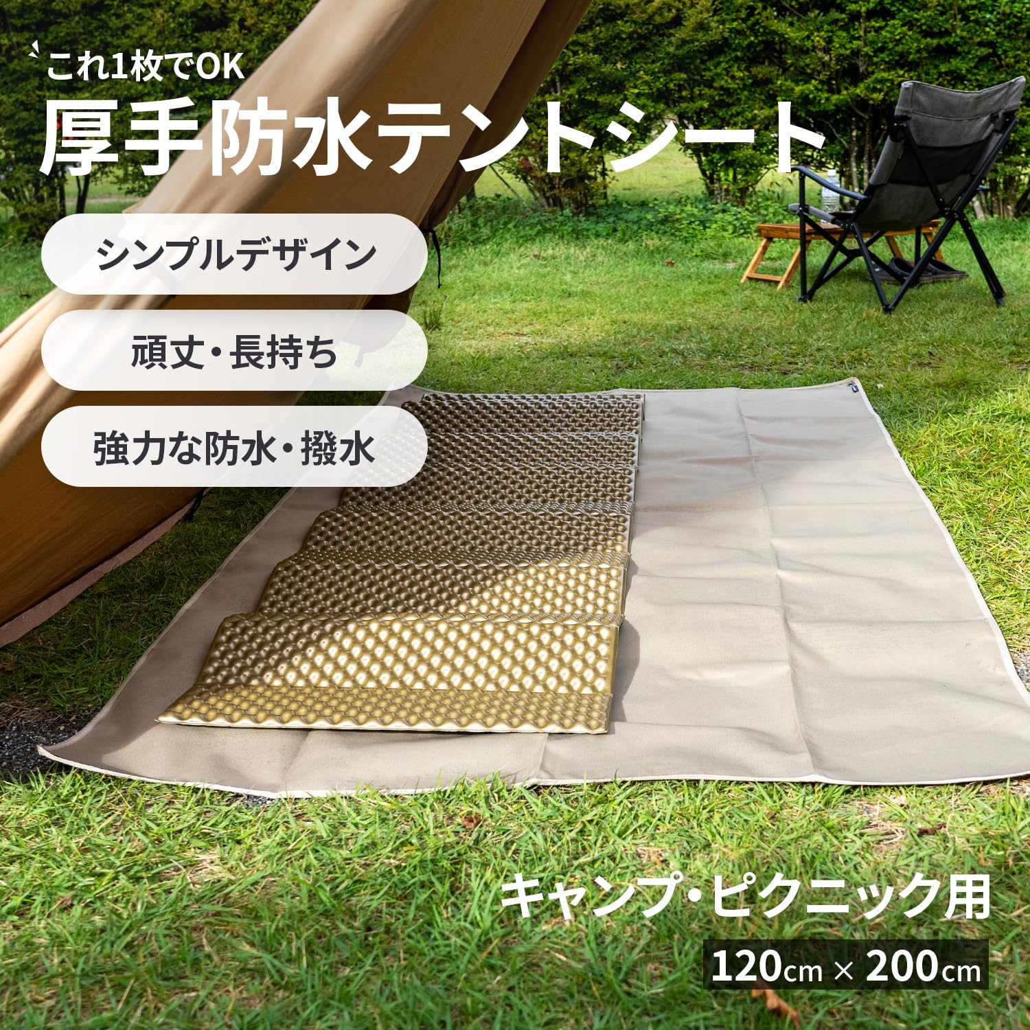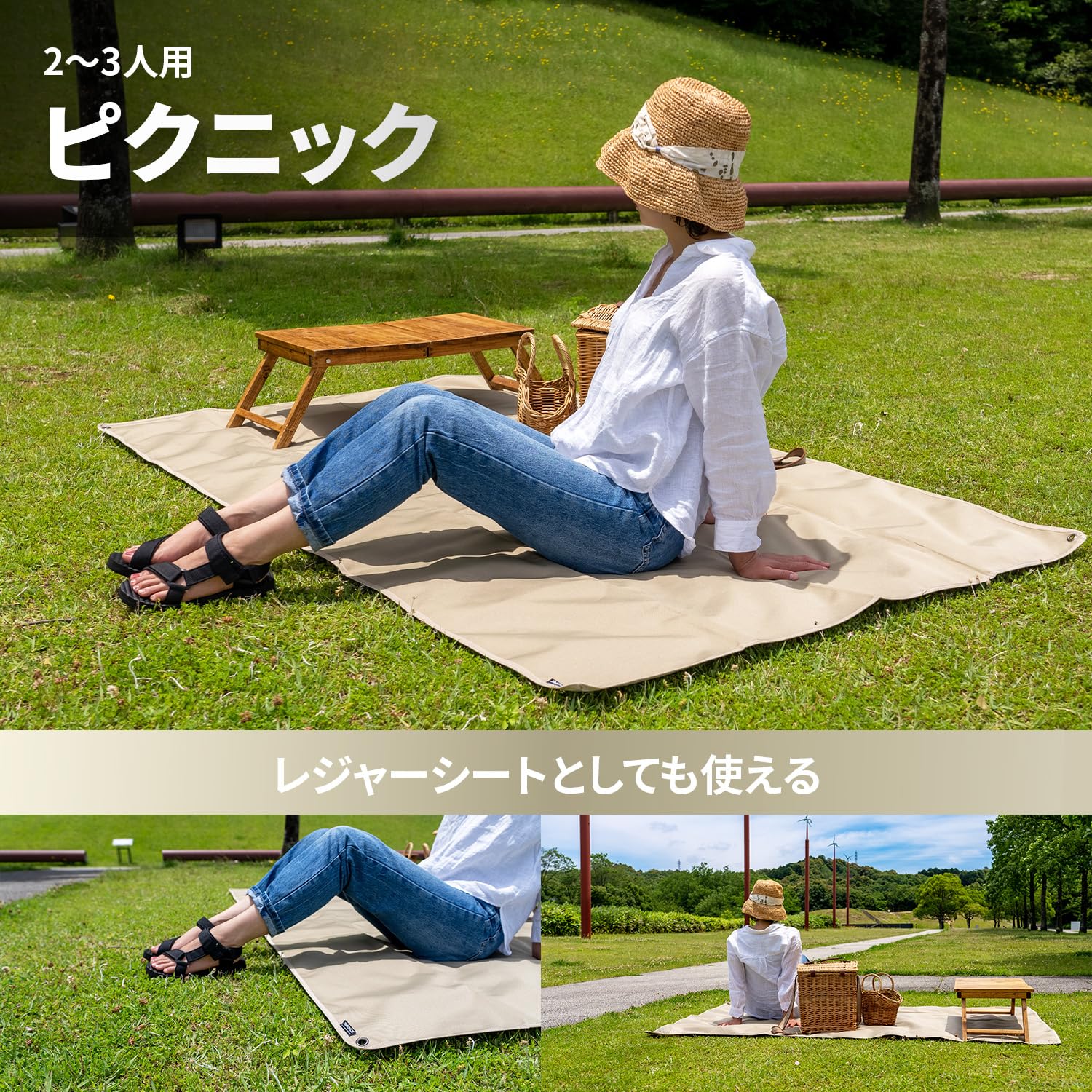 【防水これ1枚でOK】●裏面:キャンプ一晩使用可能。ポリウレタンコーティングが地面からの湿気を抑え、裏はびっしょり濡れても表はサラサラです。汚れが付着しても水をかければツルンと簡単に落ちるので片付け簡単です。●表面:撥水性があり、水や汚れをポロポロ弾きます。濡れにくいためシートが水を吸って重くなるのを防げるのもメリットです●シート端部:ぐるっと1周するフチは非撥水素材のため濡れてしまったら乾かす必要があります。