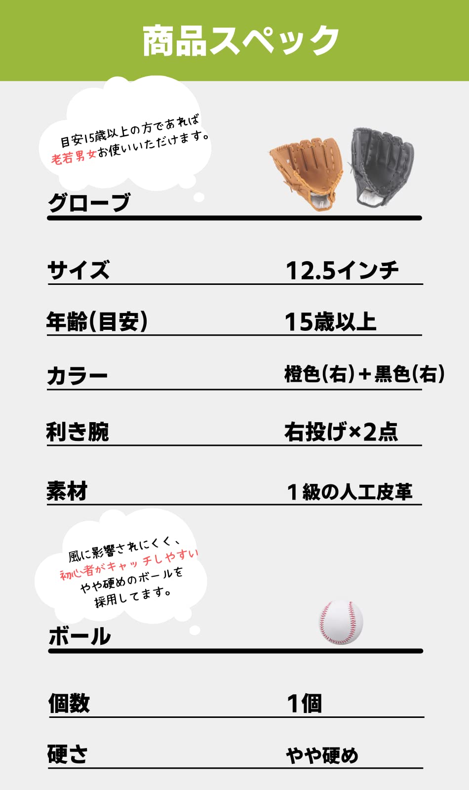 届いてすぐにキャッチボールができるように、大人用グローブ2点とボール1点が付いたお得なセットです。 本商品は、【右投げ×2点+ボール1点のセット】です。