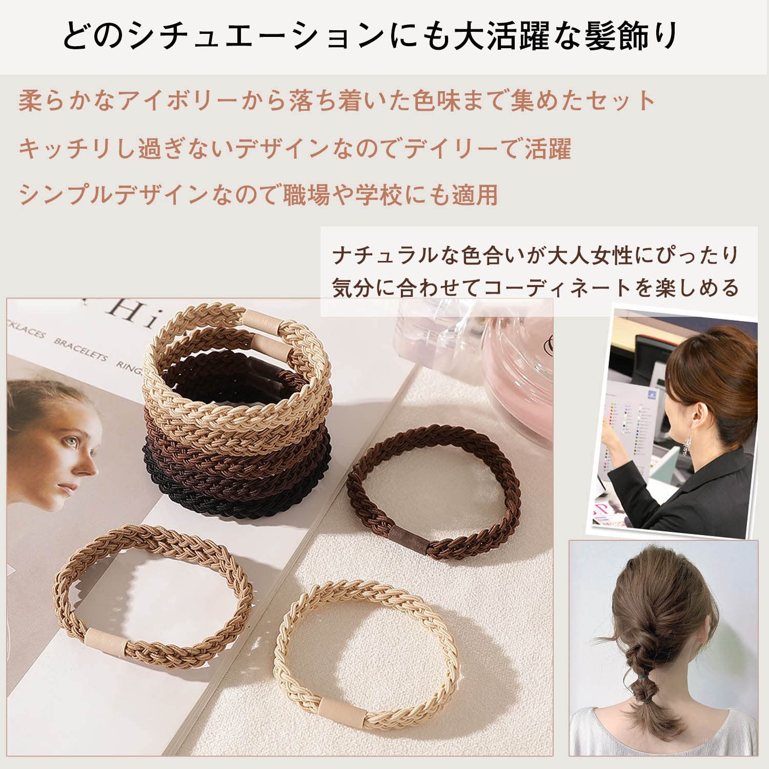 ??【ナチュラル自然に】日本人の髪色に合わせた黒や茶色の色が入れたセットだからきちんとした印象に。【商品仕様】○サイズ:直径5cm/ロープ幅1cm ○カラー:ブラック/ダークブラウン/ブラウン/カーキ/ミルキーホワイト ○セット内容:単色5個*2セット