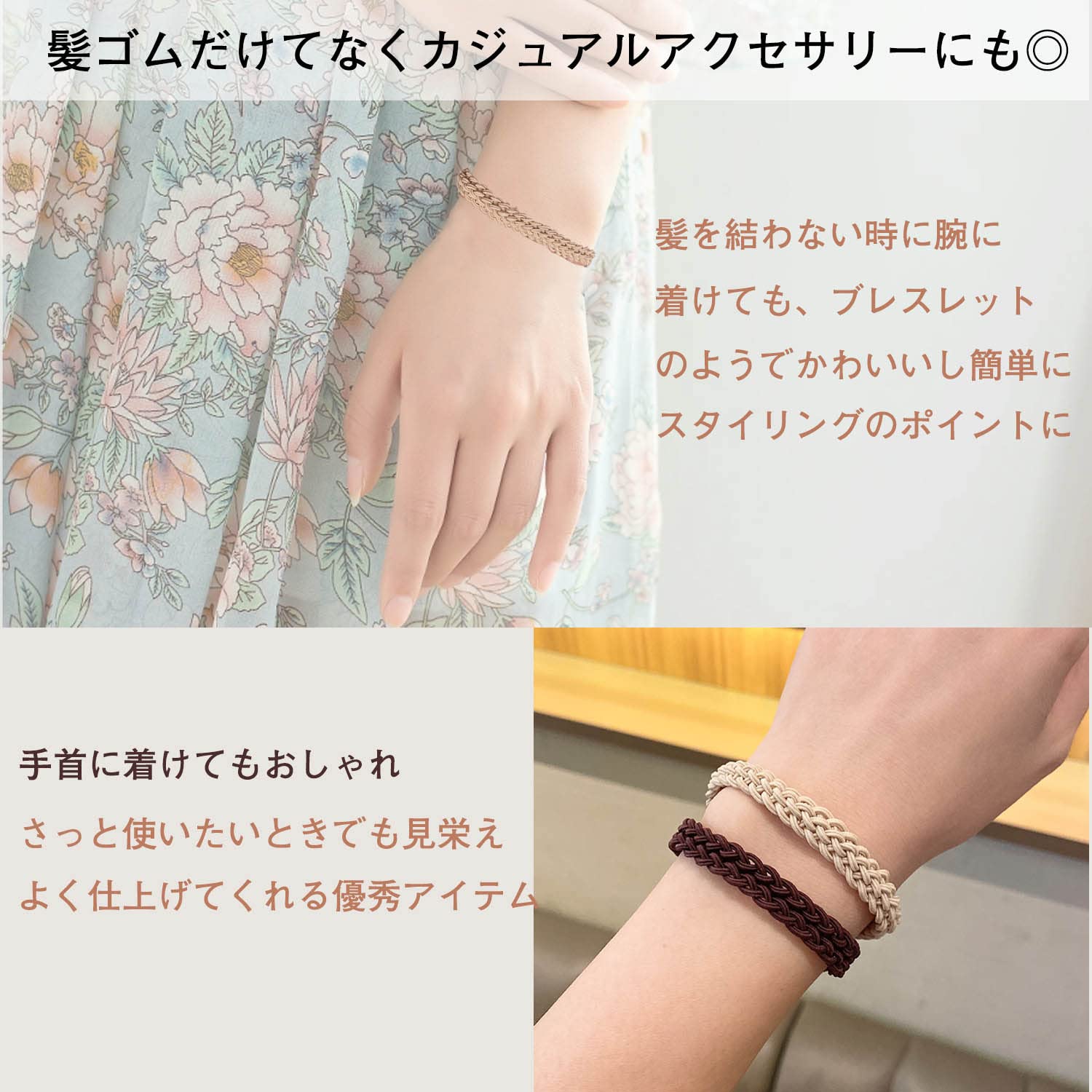 ??【髪ゴムだけてなく】カジュアルアクセサリーにも◎髪を結わない時に腕に着けても、ブレスレットのようでかわいいし簡単にスタイリングのポイントに。さっと使いたいときでも見栄えよく仕上げてくれる優秀アイテム。