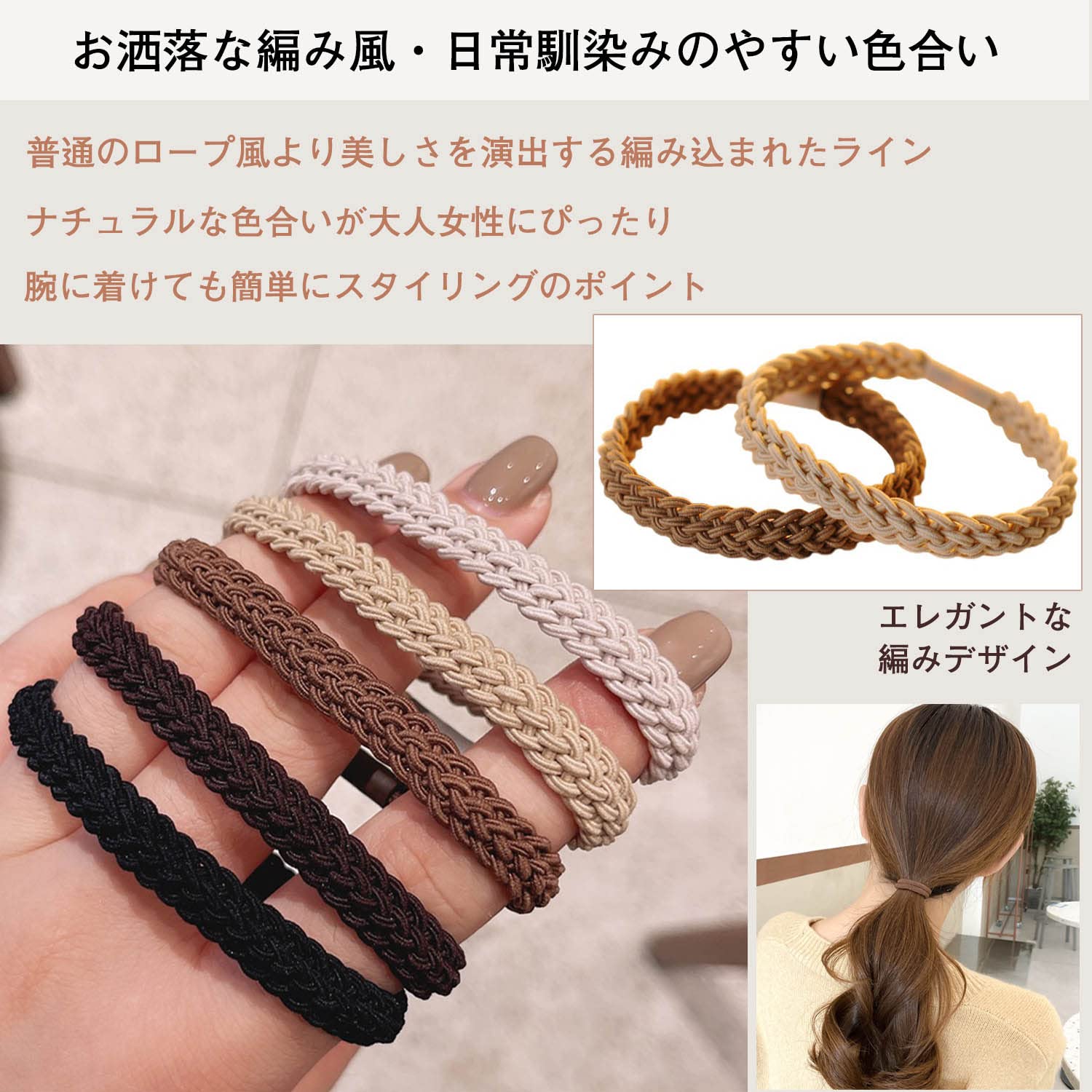 ??【シンプルながらデザインある編みロープ風セット】落ち着いた色味とロープ状の風合いがおしゃれな5色セットヘアゴムが日常使いにぴったり。ナチュラルなカラーでカジュアルアクセサリーにもなるだけだなく、普通編みと違う格上げるデザインもスタイリッシュを演出できる。