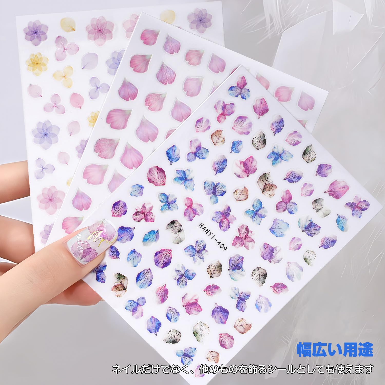 【春季限定】春限定の紫陽花ネイルシールは、色とりどりの花と相まって春の雰囲気を強く感じさせ、春から夏にかけての季節にぴったりです
