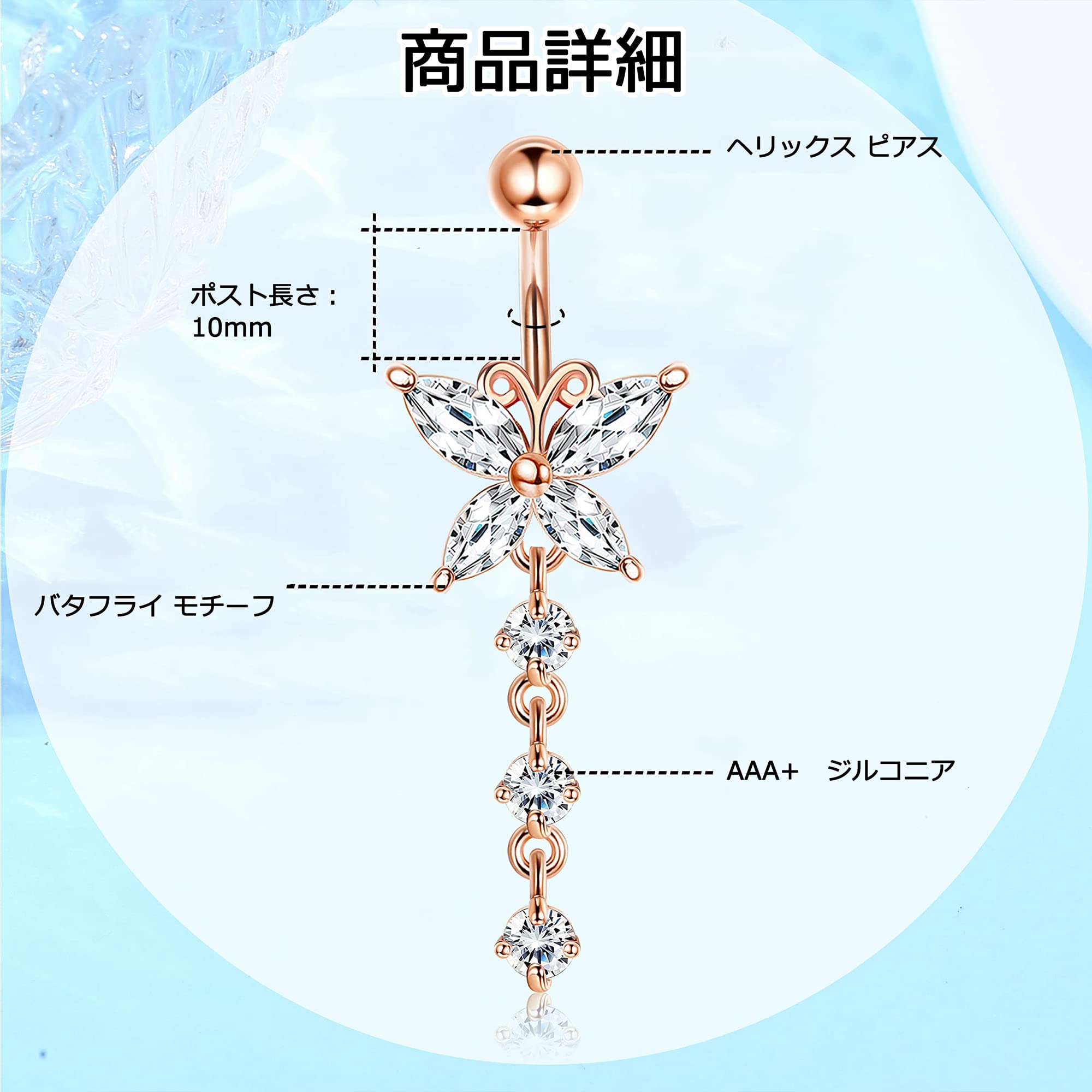 [Jstyle] ボディピアス レディース ヘソ ピアス 蝶 揺れる ステンレス ピアス 臍 金属アレルギー対応 かわいい ピンク ホワイト ジルコン 誕生日 プレゼント クリスマス 8個 ピンクゴールド キラキラ バタフライ ボディピアス 14G