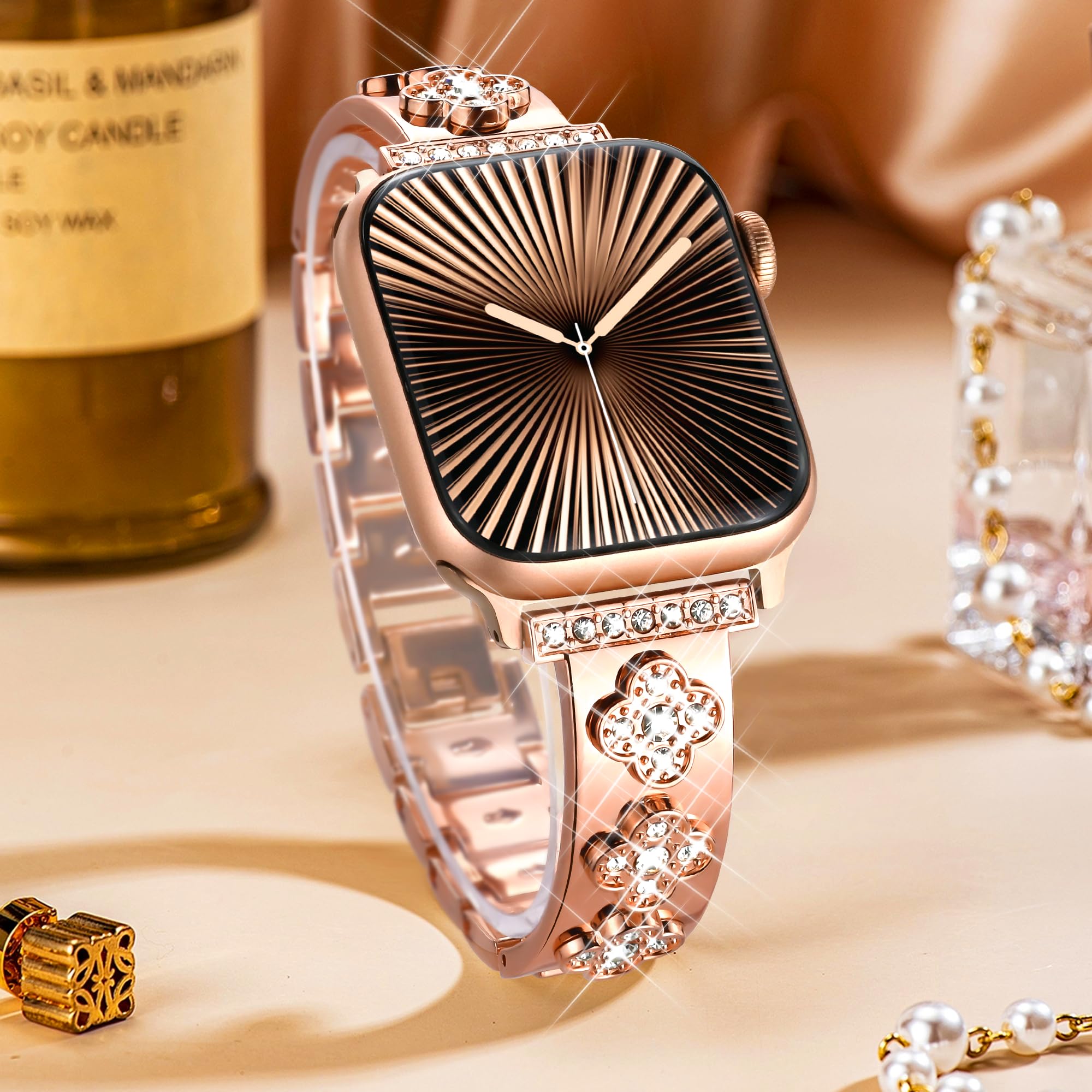 [Bokoios] キラキラ四つ葉のクローバーベルト互?アップルウォッチ バンド レディース 42mm 41mm 40mm 38mm おしゃれコンパチブルApple Watch バンド かわいい互?Apple Watch 10 幸運バングルバンドアップルウォッチ ベルト メタルコンパチブルアップルウォッチバンドiWatch Series 10 SE 9 8 7 6 5 4 3-ローズゴールド
