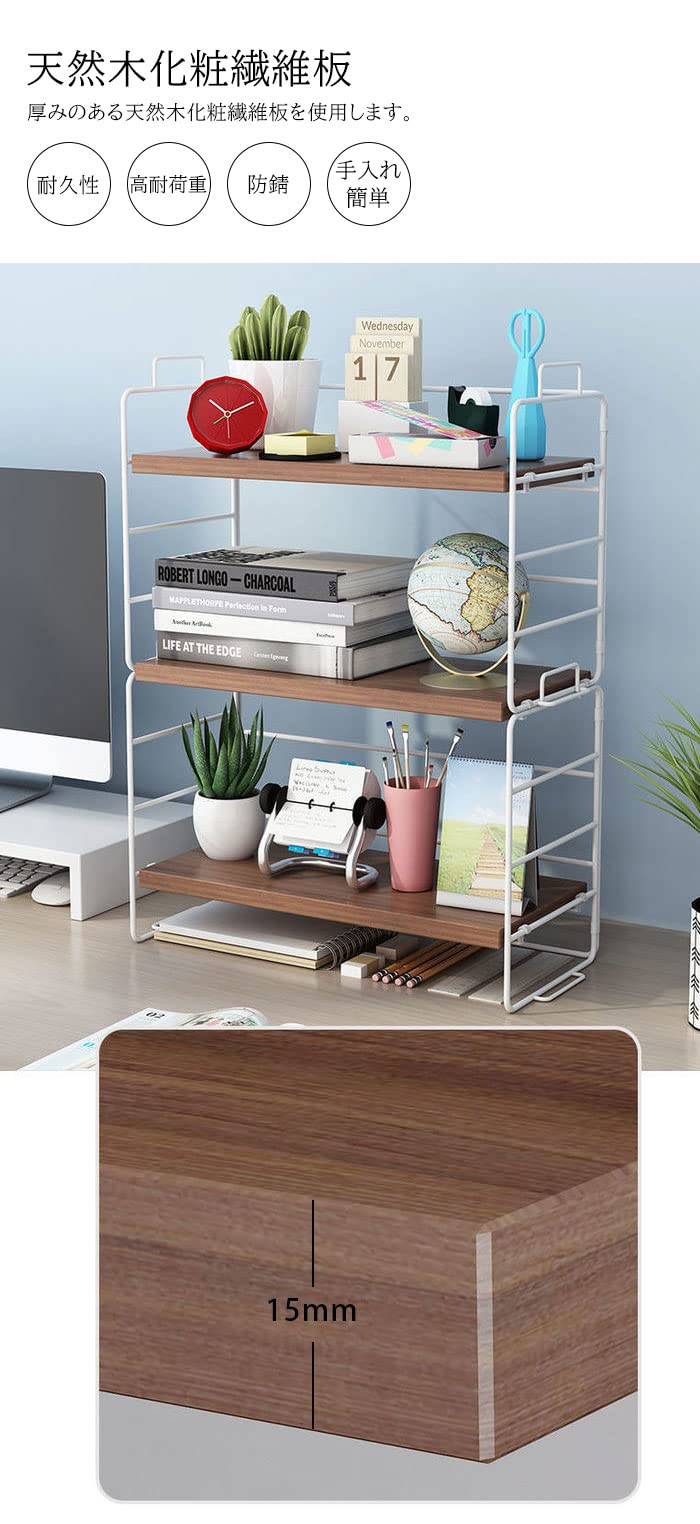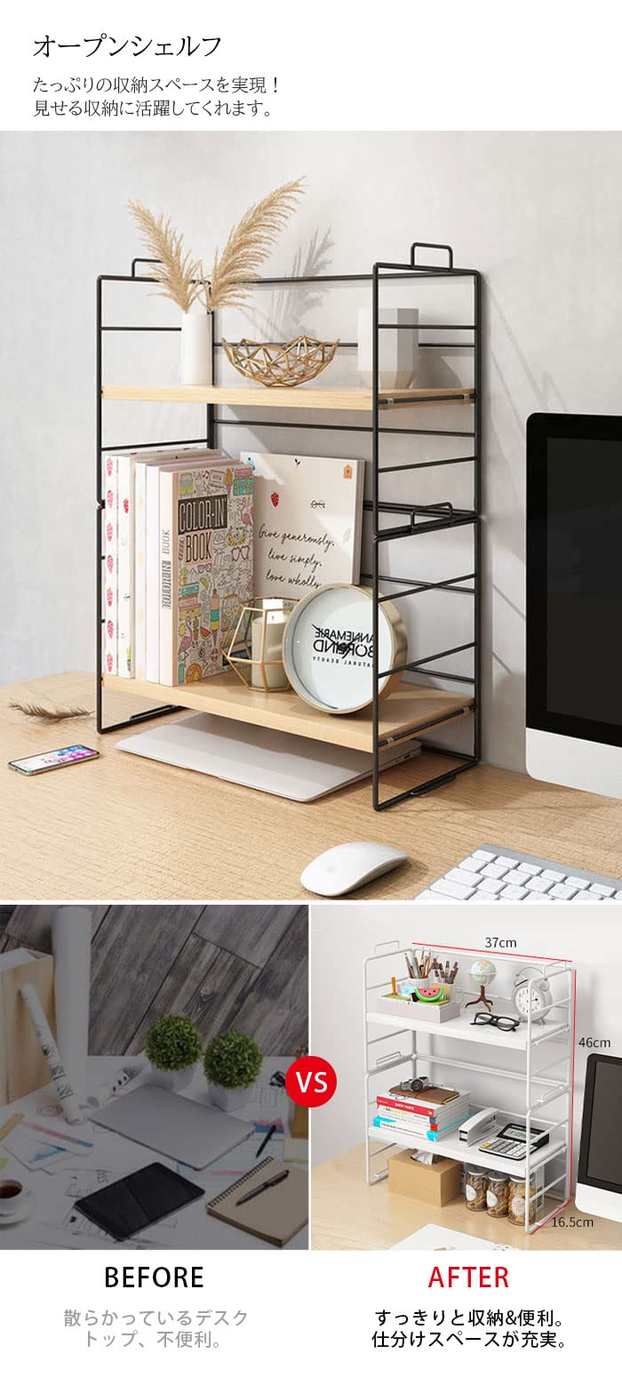 オープンラック 本棚 デスク収納 ラック 上置棚 シェルフ 収納ラック 棚 収納棚 北欧 机上ラック テーブルラック本 文房具 飾り 小物置き 整理 組立簡単 (棚板3枚 ウッド色棚板+白色フレーム)