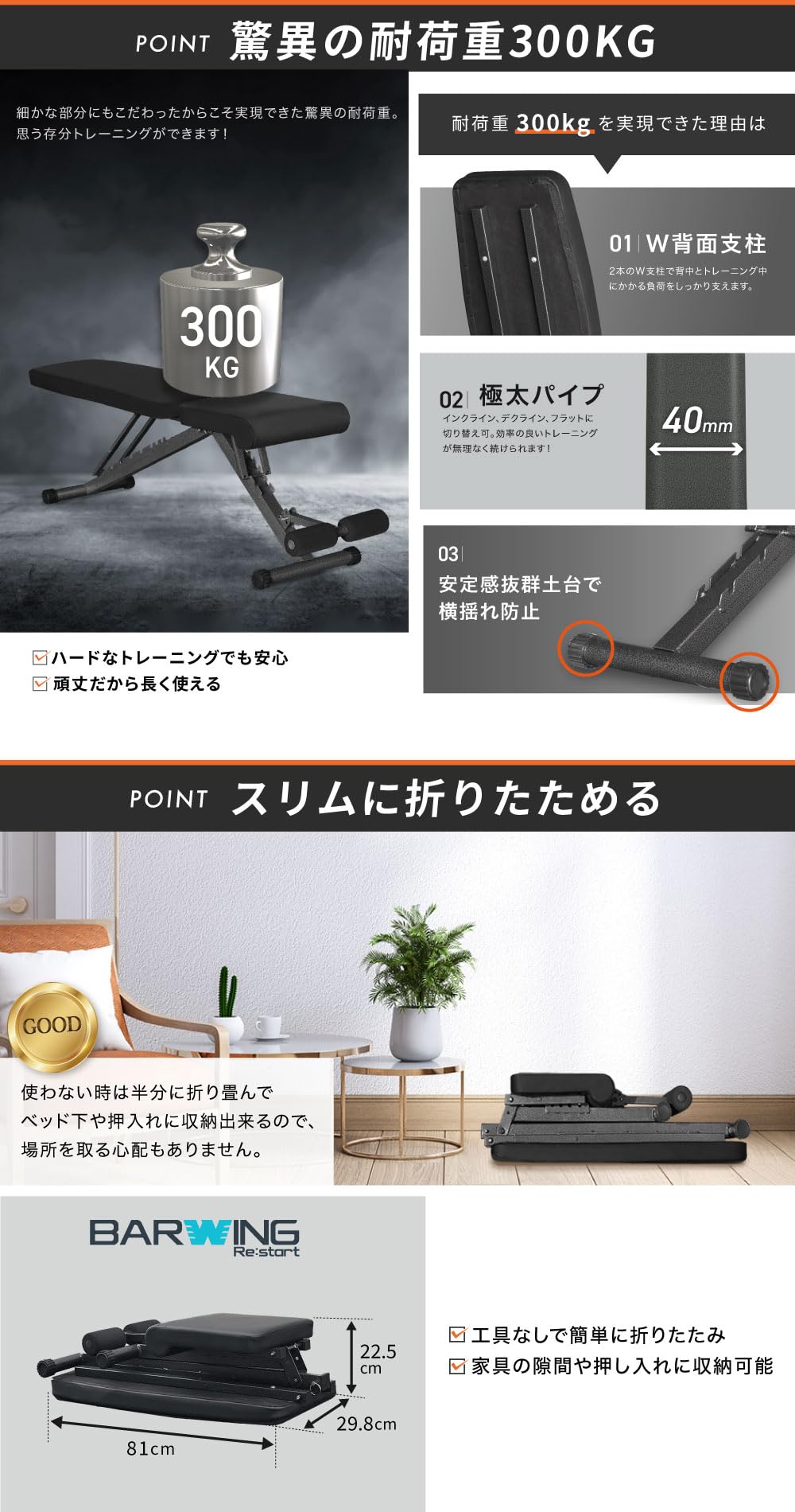 BARWING(バーウィング) 可変式 トレーニングベンチ 4WAY インクラインベンチ 折り畳み デクラインベンチ フラットベンチ 角度調節簡単 収納便利 アジャスタブル ベンチプレス 筋トレ