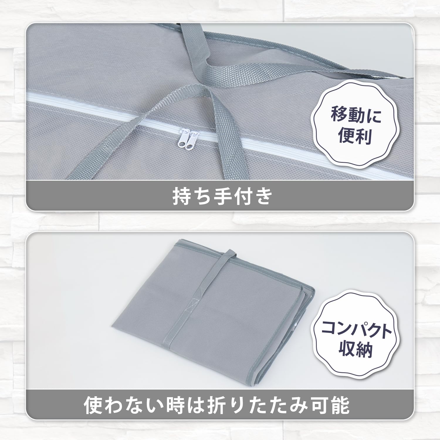 【持ち手で簡単に持ち運び】:持ち手付きでクリーニングに出す際や引っ越しの際なども持ち運びがしやすい。