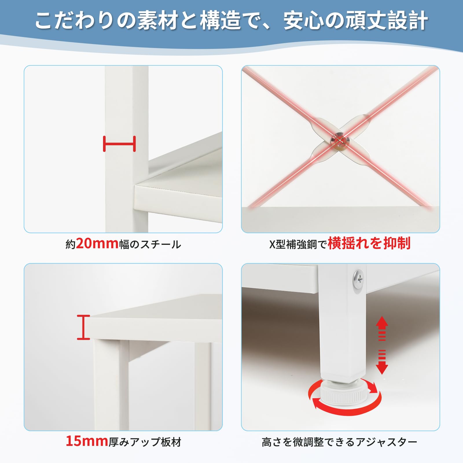 【頑丈な構造&安定性抜群】15mm厚の棚板と20mm幅のスチールパイプを使用し、最大耐荷重は約150kgで、安心に使用できます。X型補強鋼による横揺れ防止で、重い調理家電や食器類も安心して置ける堅牢設計。高品質の合成樹脂合板を採用し、表面に防水コーティング加工、傷に強く、耐水性もよく。濡らした布で拭くだけで清潔に保てるので、お手入れが楽々です。長く使える信頼できる製品です。