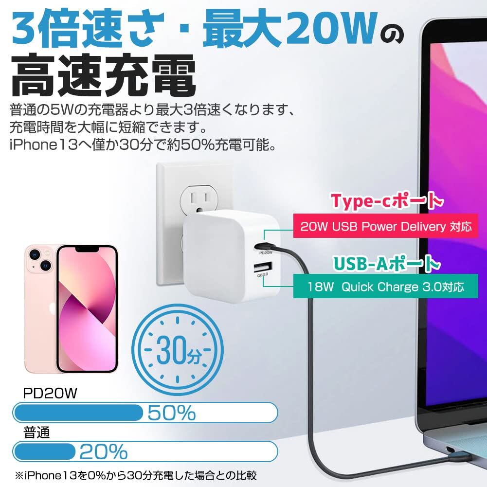 【特価商品】Besince 【PSE認証済】USB充電器 2ポート PD充電器 ACアダプター 20W USB-C タイプ-C 急速充電器 PD3.0 QC3.0アダプター USBコンセント コンパクト 同時充電 充電アダプタ 急速 高速充電 電源タップ ホワイト