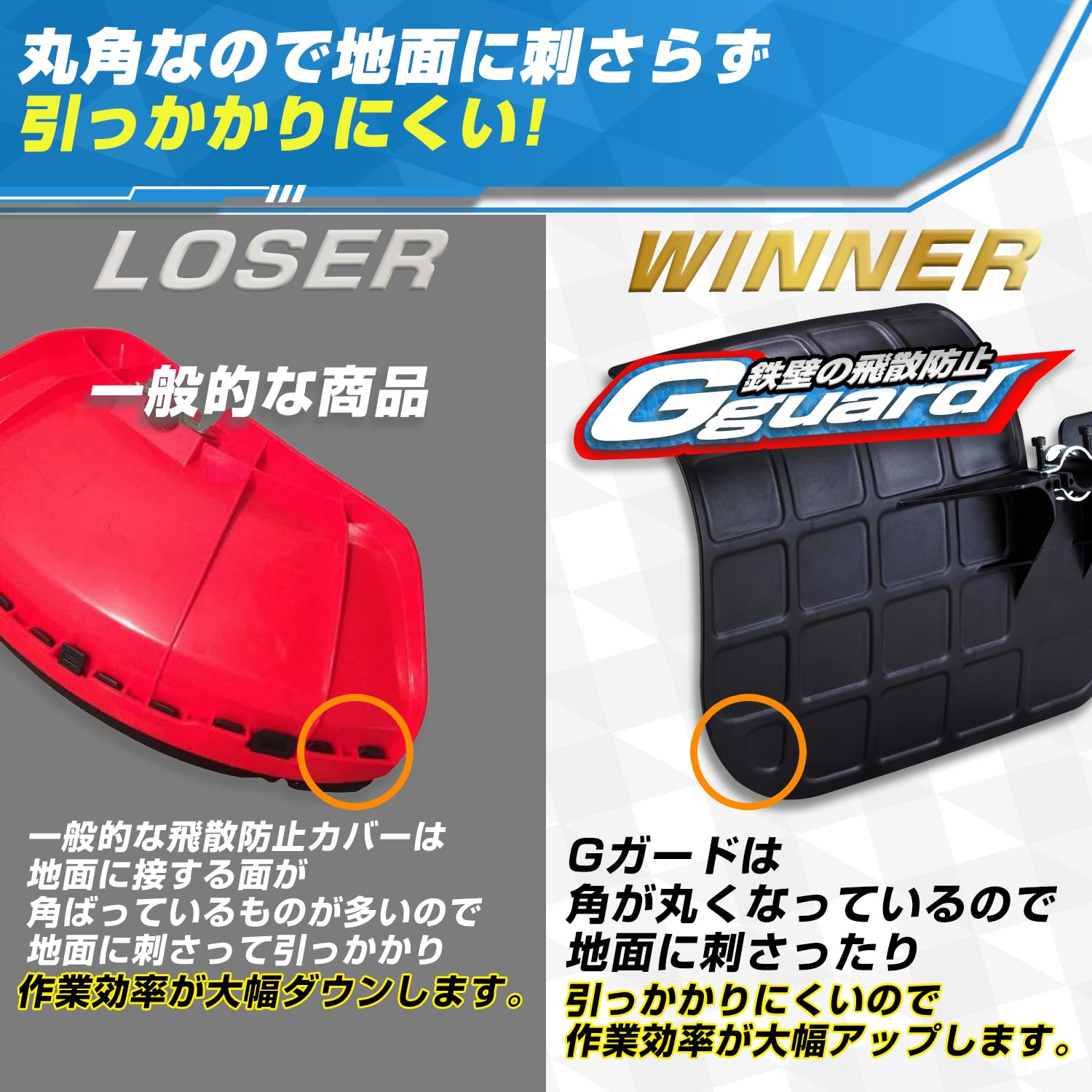 飛散防護カバー 広い防護面積で草刈りの飛散物を効果的にシャットアウト。作業者を守ります。 角を丸くしてあり、使用時に地面にひっかかりにくい形状 取付ボルトに六角を採用。ねじがなめにくく長期使用が可能。