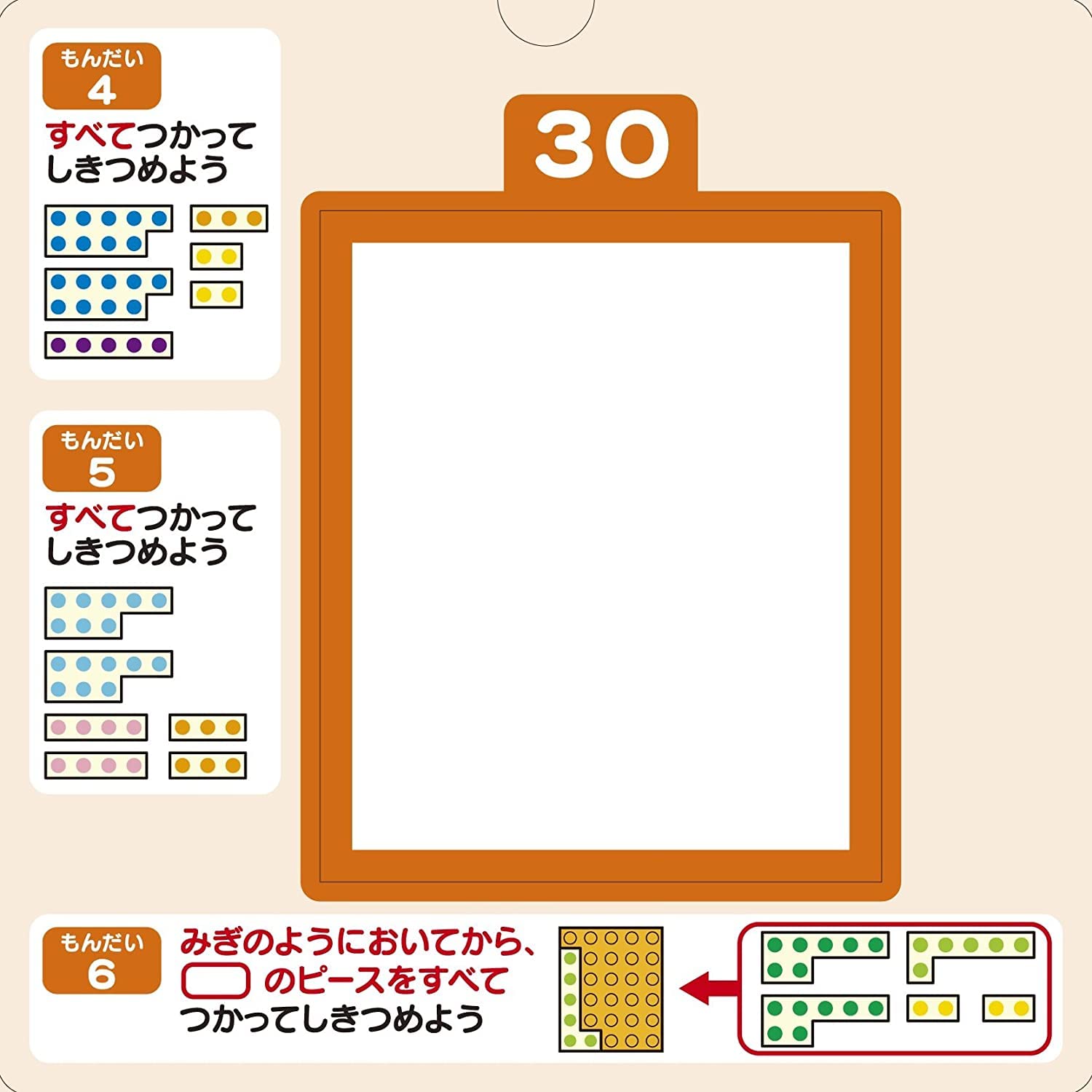 1から10の「数ピース」を組み合わせて、ボードの中にしきつめるパズルです。100個のおうとつがあるボードにしきつめるパズルで遊ぶことで、1から100までの数量の感覚を養います。