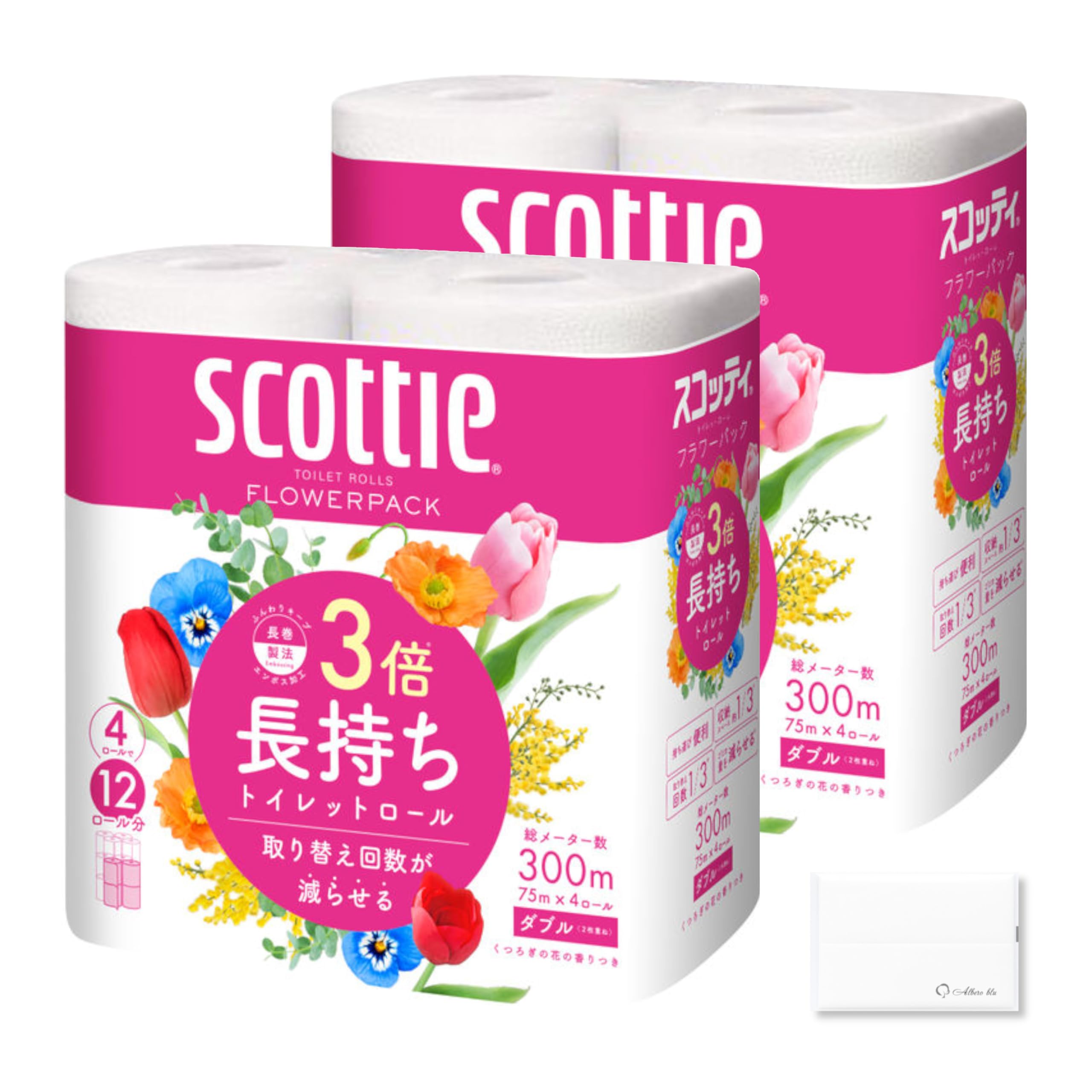 【新着商品】スコッティ フラワーパック 3倍長持ち トイレットペーパー 75m ダブル(75m * 4ロール * 2袋セット) SCOTTIE オリジナルティッシュ付 まとめ買い