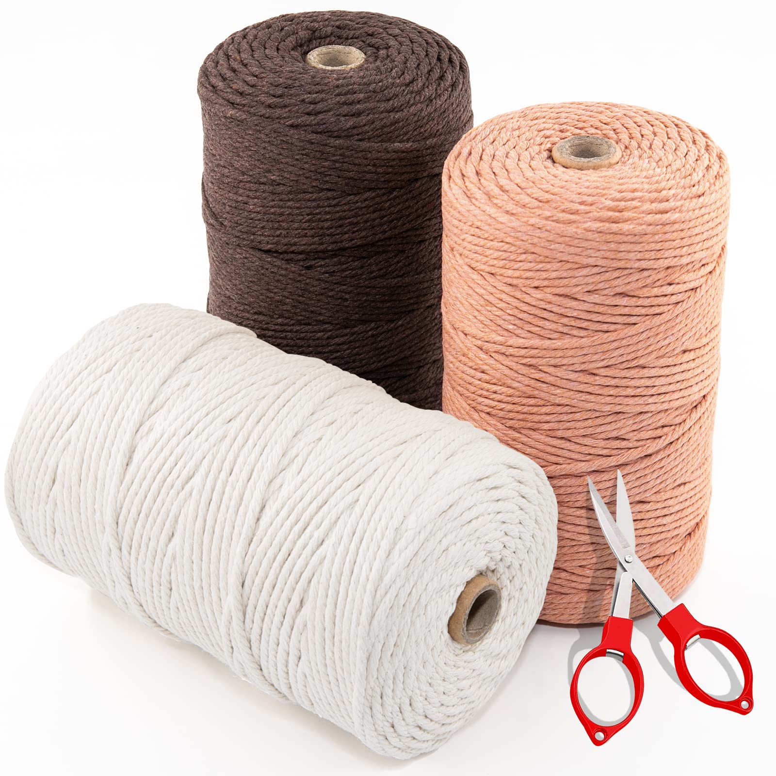 【サイズと包装】1巻き当たり長さ約220ヤード(200 M)、直径3 mmのマクラメ糸、スーツに3巻きの(サーモンピンク,アイボリー,ダークブラウン)いマクラメ糸がついていて、1本のはさみがついていて切断して使いやすいです。これは4本の撚り100%綿糸です。手芸プログラムには、マクラメ糸は厚くて頑丈です。