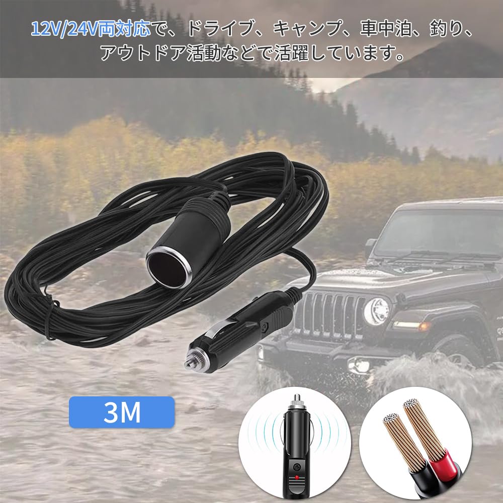 シガーソケット 延長ケーブル 3M DC電源 12V/24V 車用 シガーライター延長コード 延長プラグ 急速充電 ソケット LED指示ライト付き シガーアダプター用延長コード ブラック(3M)