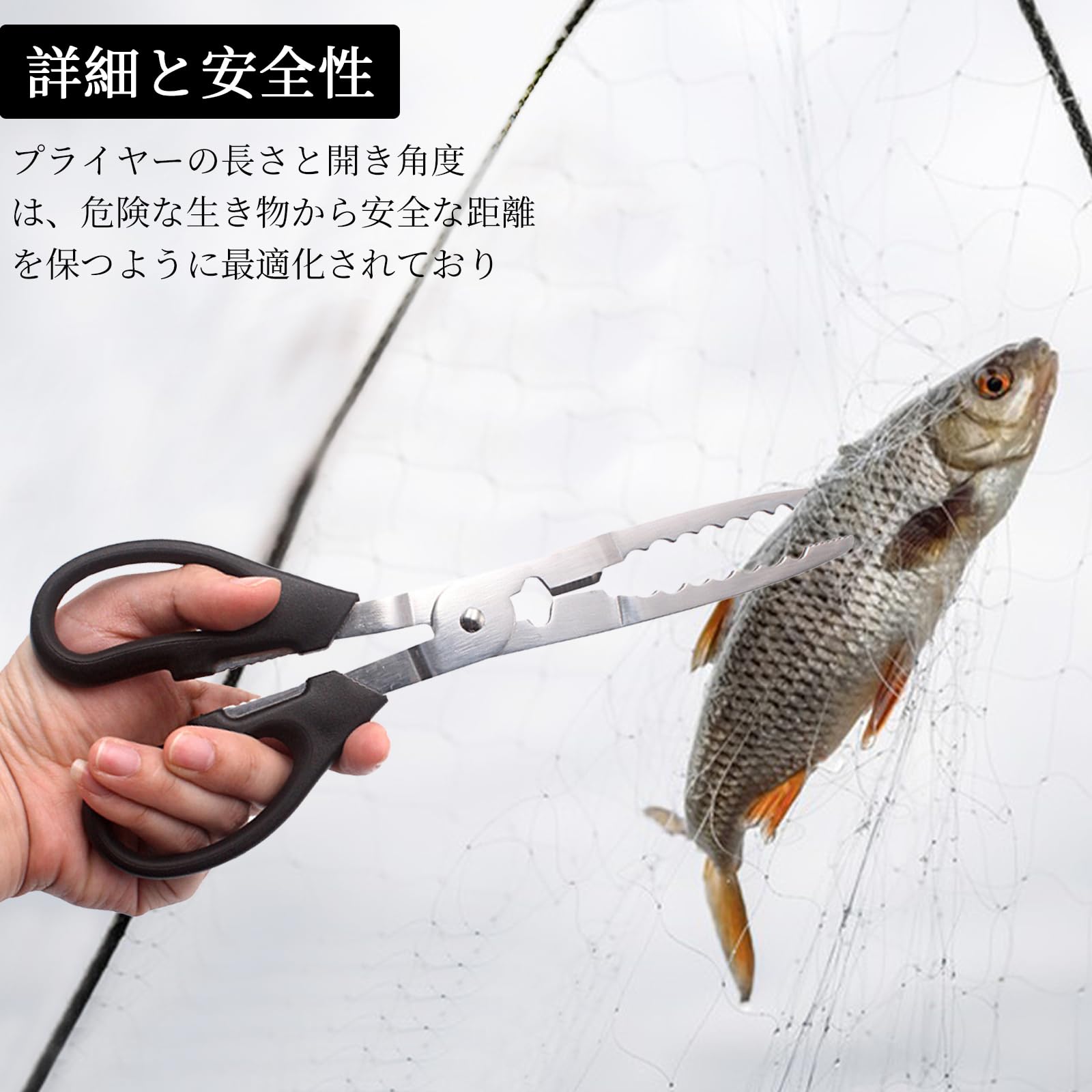 【多用途】: このフィッシングプライヤーは、さまざまな釣りや魚介類の取り扱いに適しています。 川でも湖でも海でも、簡単に扱えます。 また、カニやエビなど、より危険な魚介類の捕獲にも適しており、作業中の安全性を確保し、手が直接触れることによる怪我を防ぎます。