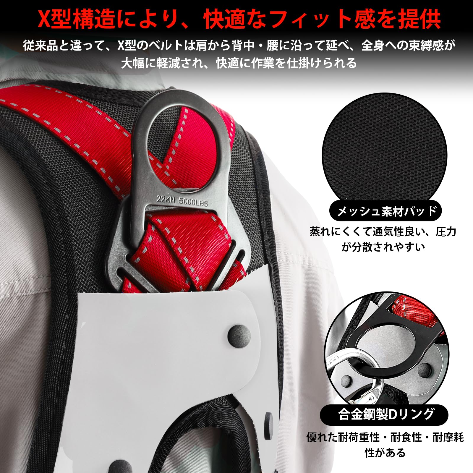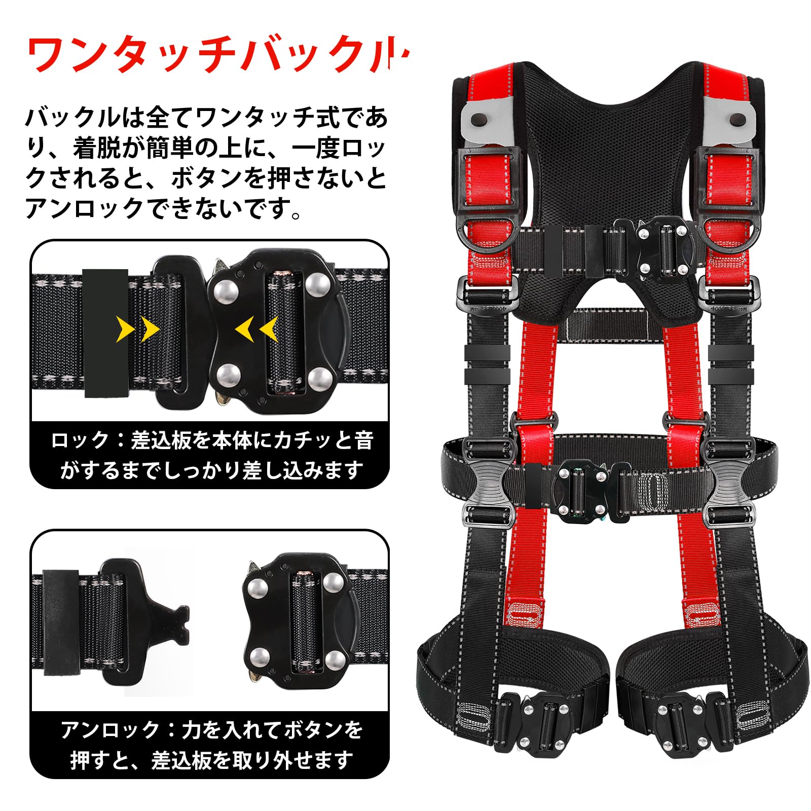 【脱着便利快適】:X型肩パッド付きで肩への負担を軽減して長時間着用するのに不便ではありません。パッドは通気性良くて蒸れにくいメッシュ素材を採用し、効果的に肩への荷重をX形に沿って背中に分散します。腿ベルトも同様にパッドを取り付けていて、着用するときの締め付け感を低減し、快適な着用感を実現しました。また、ハーネス安全帯はすべてワンタッチ式のバックルを用いています。合金製であるため、耐腐食性や耐荷重性や耐摩耗性などに優れています。ワンタッチバックルでは一応ロックされると、レバーを押さないと手軽にアンロックできない心丈夫なパトナーです。ワンタッチするだけで着用と脱ぐのがより簡単になります。