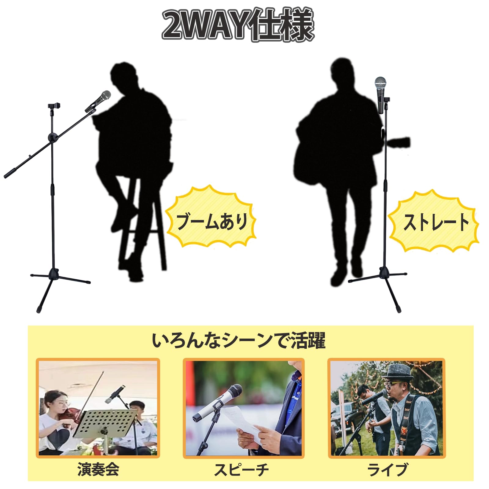 【多様なシーンに対応する】様々なシーンで使えるマイクスタンドです。 このマイクスタンドはストレートに設置するだけでなく、ブームに設置することもでき、様々な使用方法があり、様々なシーンで活躍します。マイクスタンドはストレートとブームと同時にセッティングして、弾き語りや収録、放送、演奏会などに使用できます。