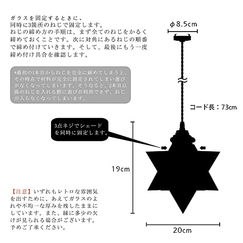 サイズ(約):幅200mm 奥行200mm 高さ190mm コード長:750mm 全高:約950mm 重量:約900g 素材:クリアガラス、真鍮、ファブリックコード シーリングカップ:なし 消費電力:MAX.60W 定格電圧:100V 取り付け方法:引掛シーリング式 電球対応:E17 備考:LED対応、蛍光球対応 ※こちらの商品には電球は付属しておりません。
