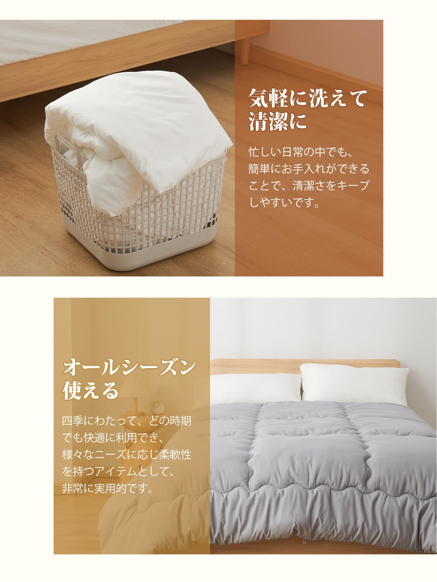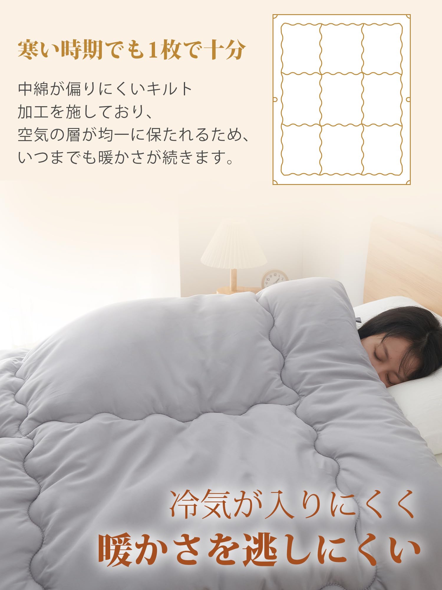【1枚でオールシーズン快適に】軽量でありながら、保温性に優れた素材を使用しているため、寒い冬の夜でも暖かく、春や秋には心地よい寝心地を提供します。